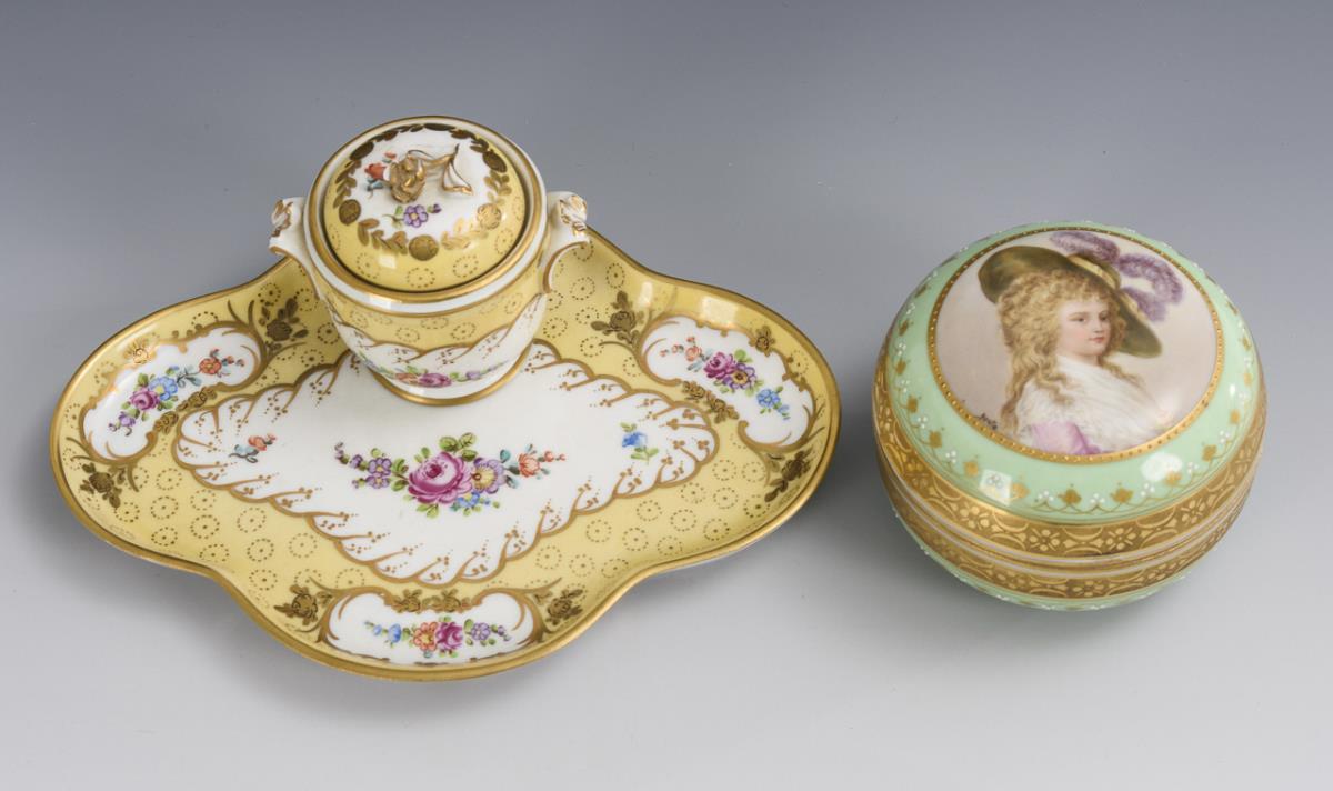 Cachepot "Altbrandenstein" (H 12.5 cm), bowl with flower opening (L 18 cm), quatrefoil writing utensil with yellow background (L 19 cm), rectangular box (L 20 cm) and round box with portrait of a lady (Ø 9 cm). Rosy knob of the inkwell lid chipped, rectangular box with glued wall break.
