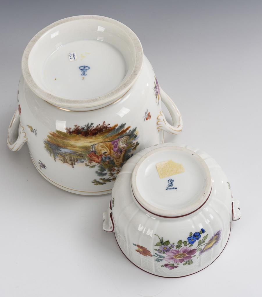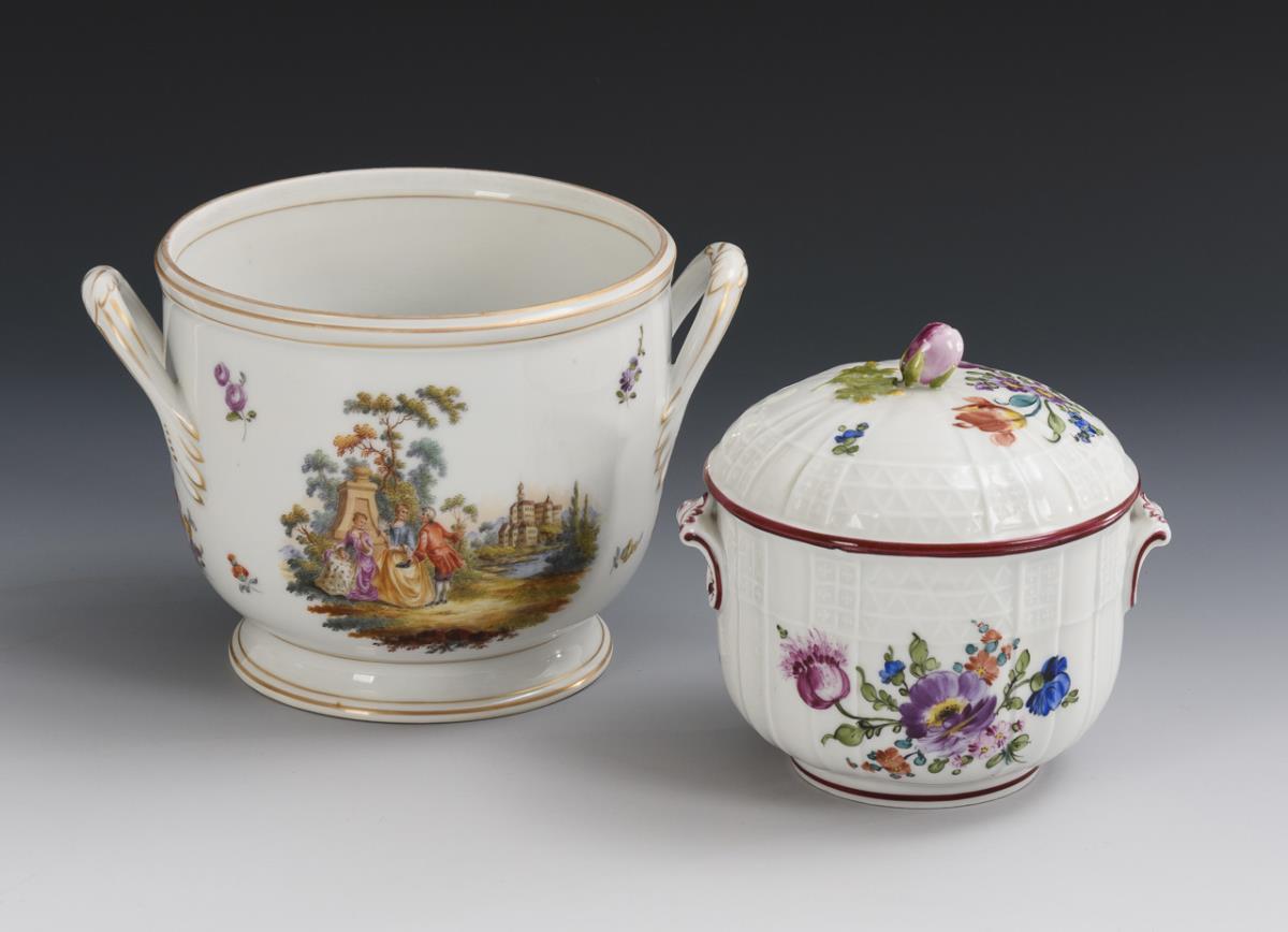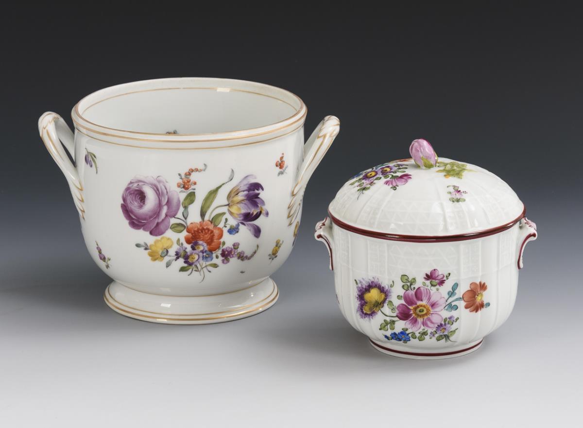 1x Potschappel: Sugar bowl with the relief decoration "Altbrandenstein" and flower painting (h 13 cm). / 1x Fasold & Stauch: Flower cachepot with two handles and Watteau painting (H 13.5 cm). Minimal wear to the rose finial of the sugar bowl, hairline crack in the base of the cachepot.