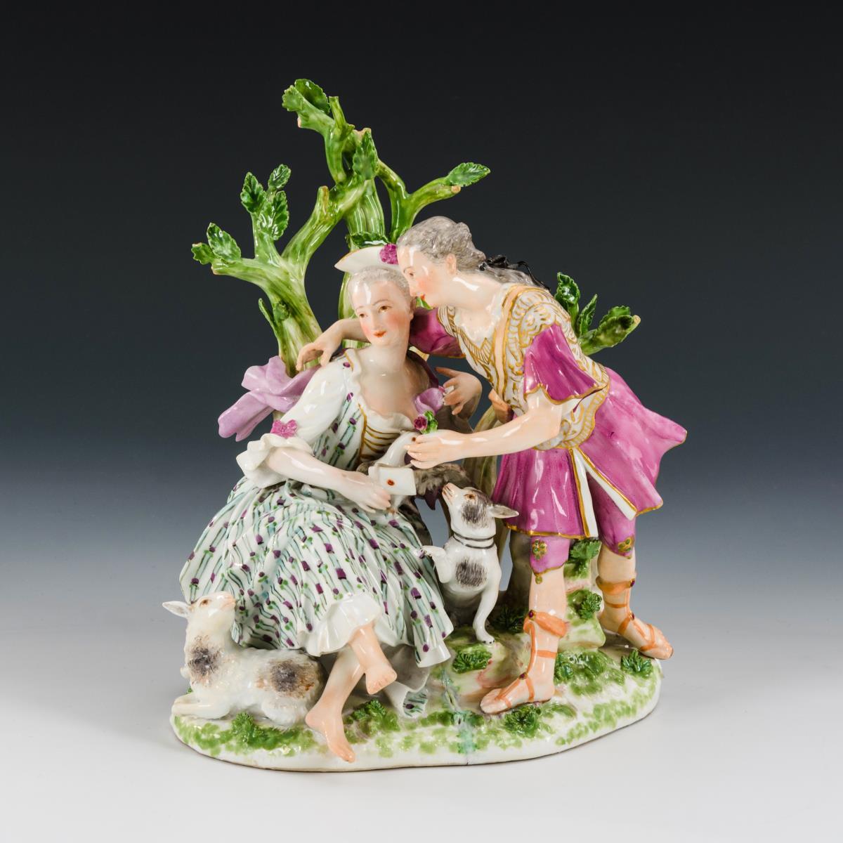Brandriss im Sockel, Füße der Dame, Lammohren sowie einige Blätter restauriert, einige Blätter fehlen.