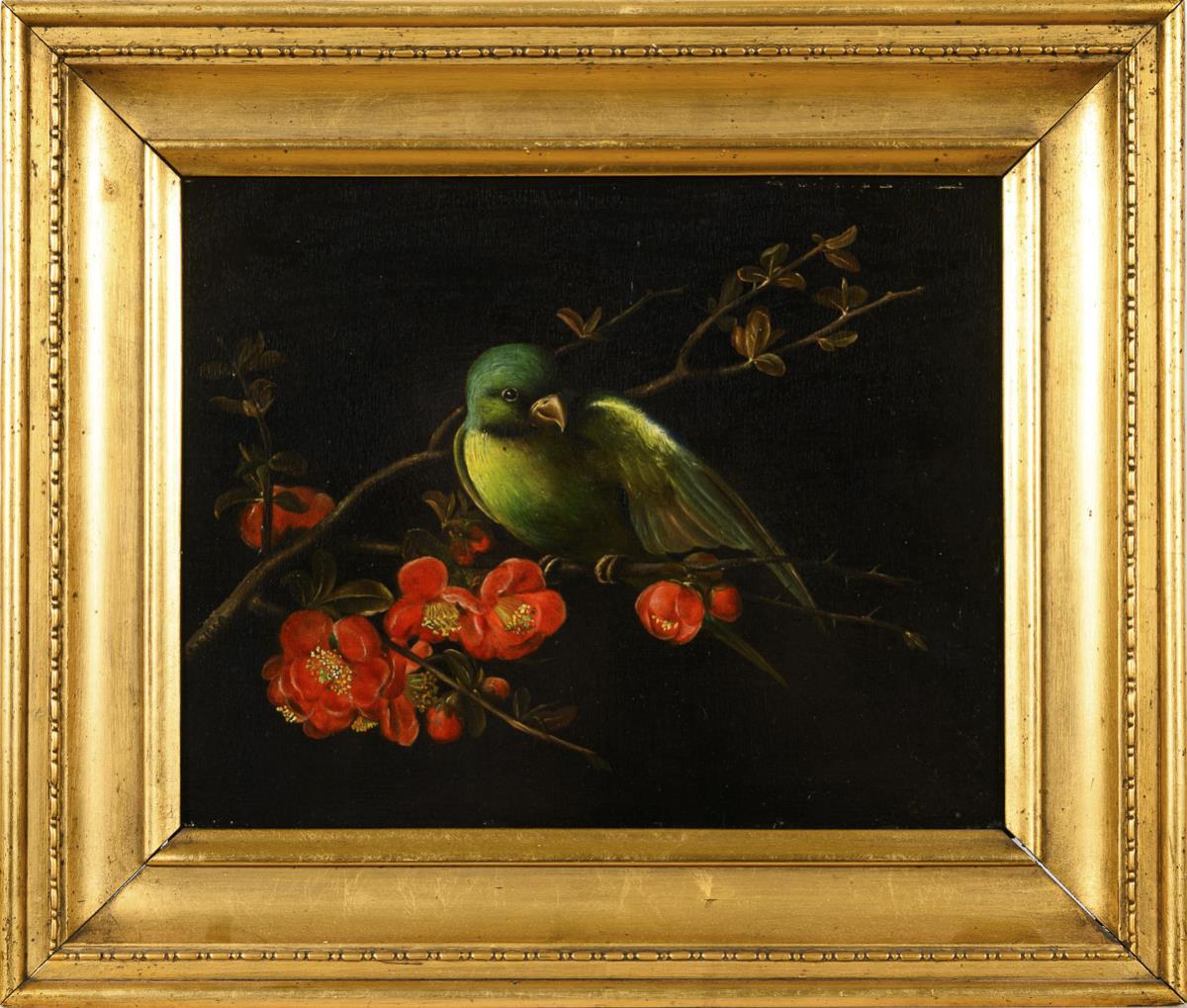The green-yellow bird on the branch decorated with red flowers against a black background. Minimal traces of age.