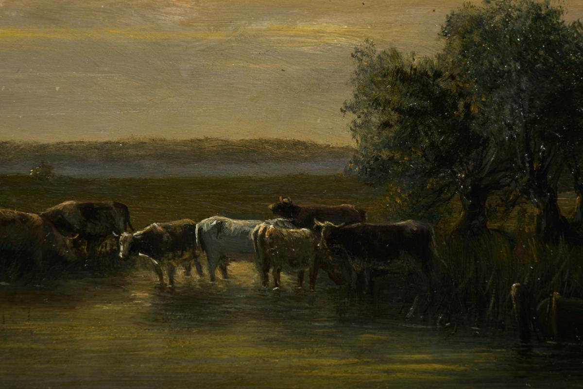 Romantic landscape with a herd of cows by a pond