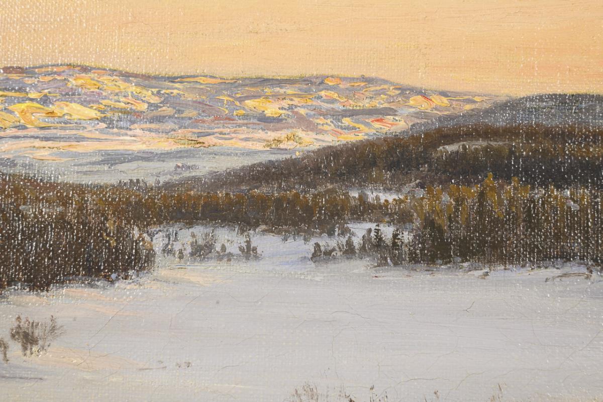 Wide snow-covered mountain landscape with forests in the setting sun. Traces of age.