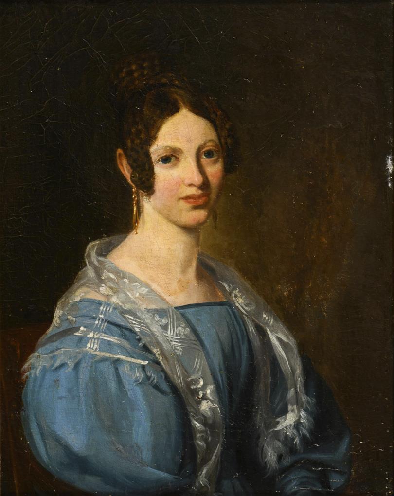 Portraits of a young man in a green frock coat with stand-up collar and a young woman with curly hair and in a blue dress. Once canvas relined, each with traces of age.