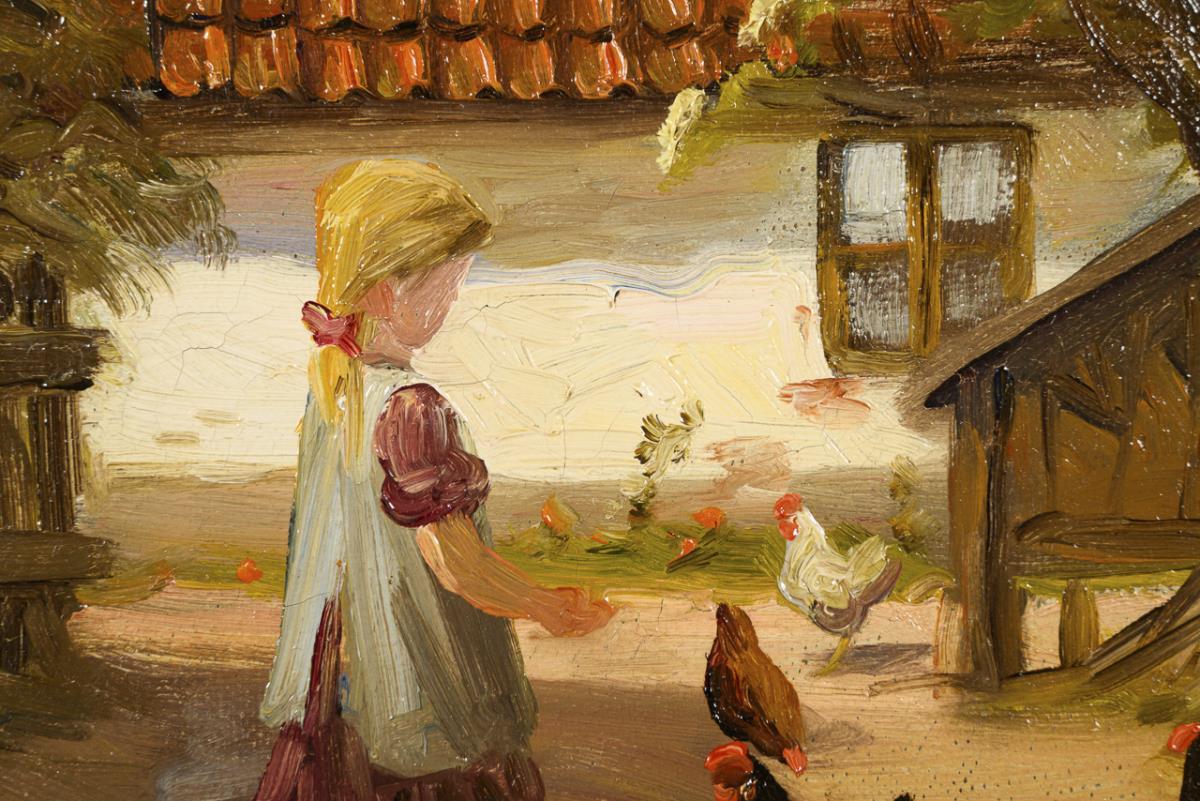 The child with the fowl in the sunny courtyard.