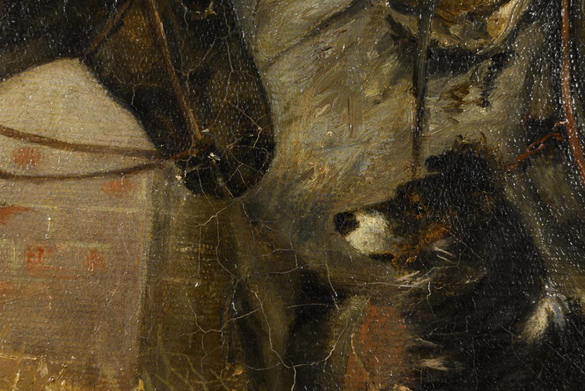 The animals in the stable on the straw in the bright light. Nail holes in the corners.
