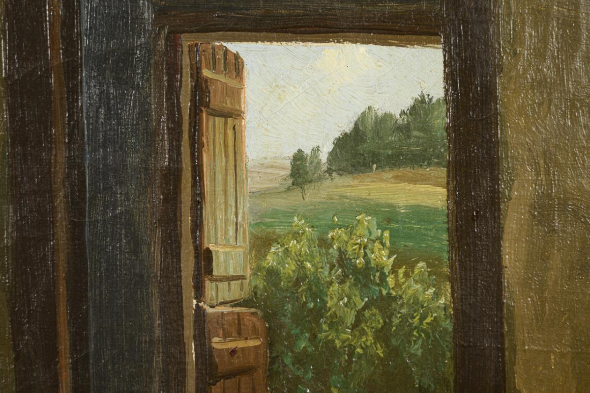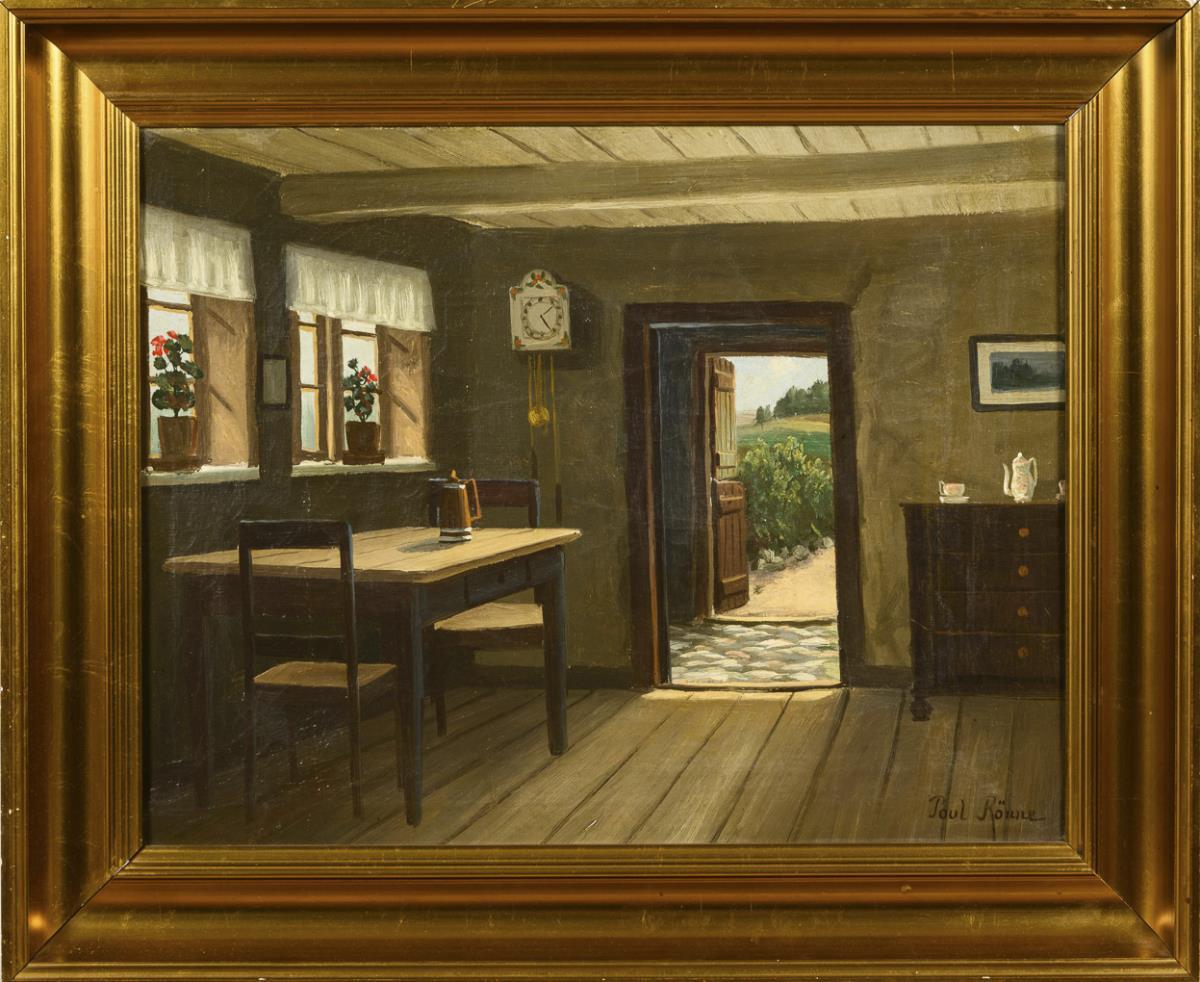 Simply furnished farmhouse with table, chairs and chest of drawers with open door. Slight traces of age.
