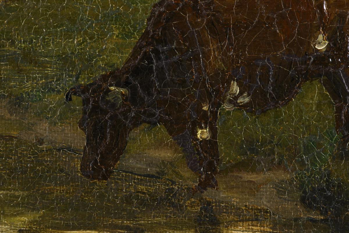 Shepherd boy with cow on the bank of a body of water in the evening. Slight traces of age.