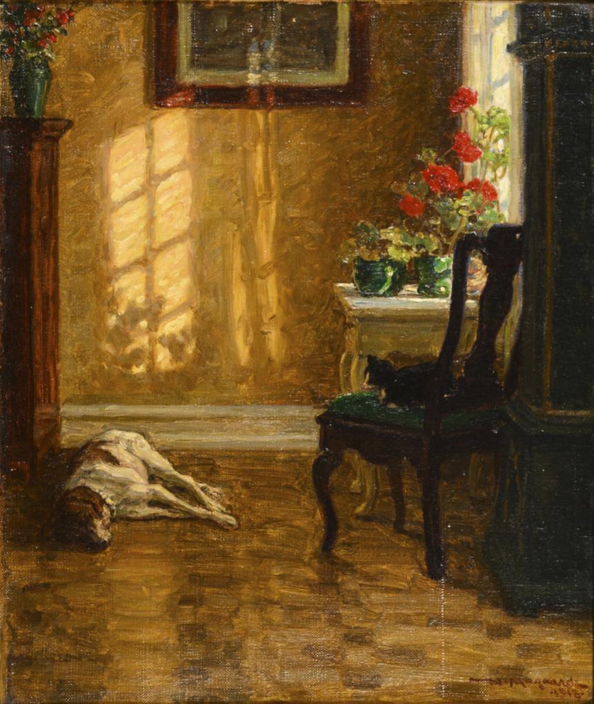The two animals in the parlor at the window in the incoming light.