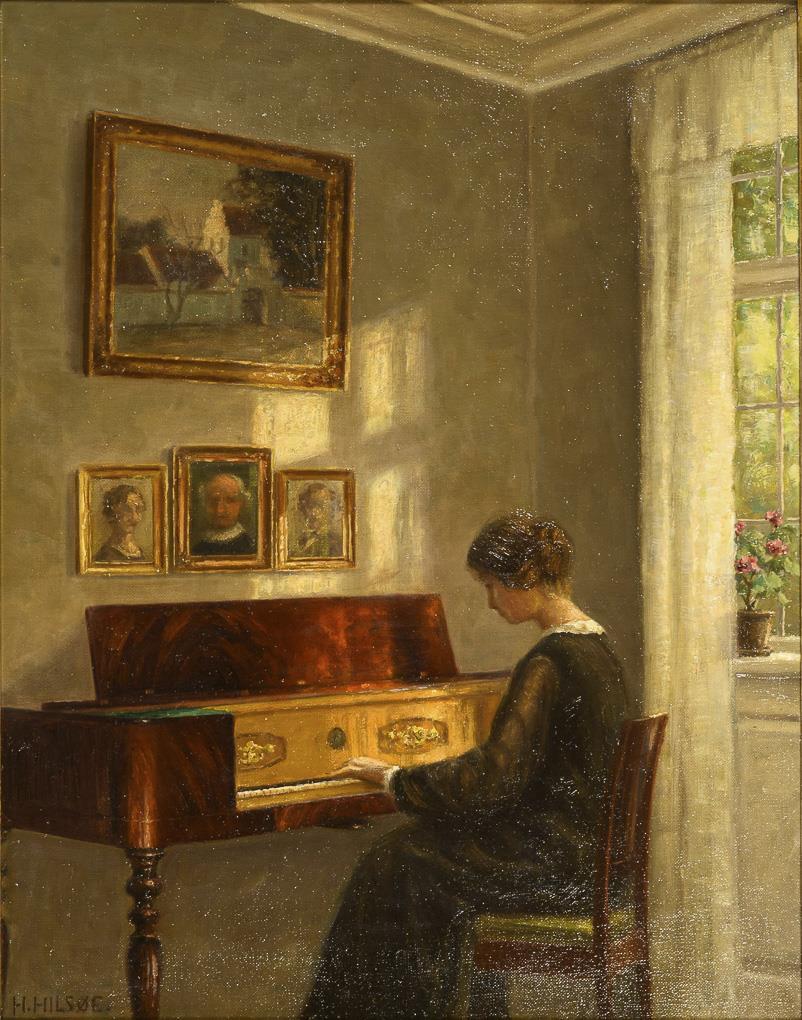 Young woman in the sunlight playing the piano in front of a wall with pictures. Minimal traces of age.