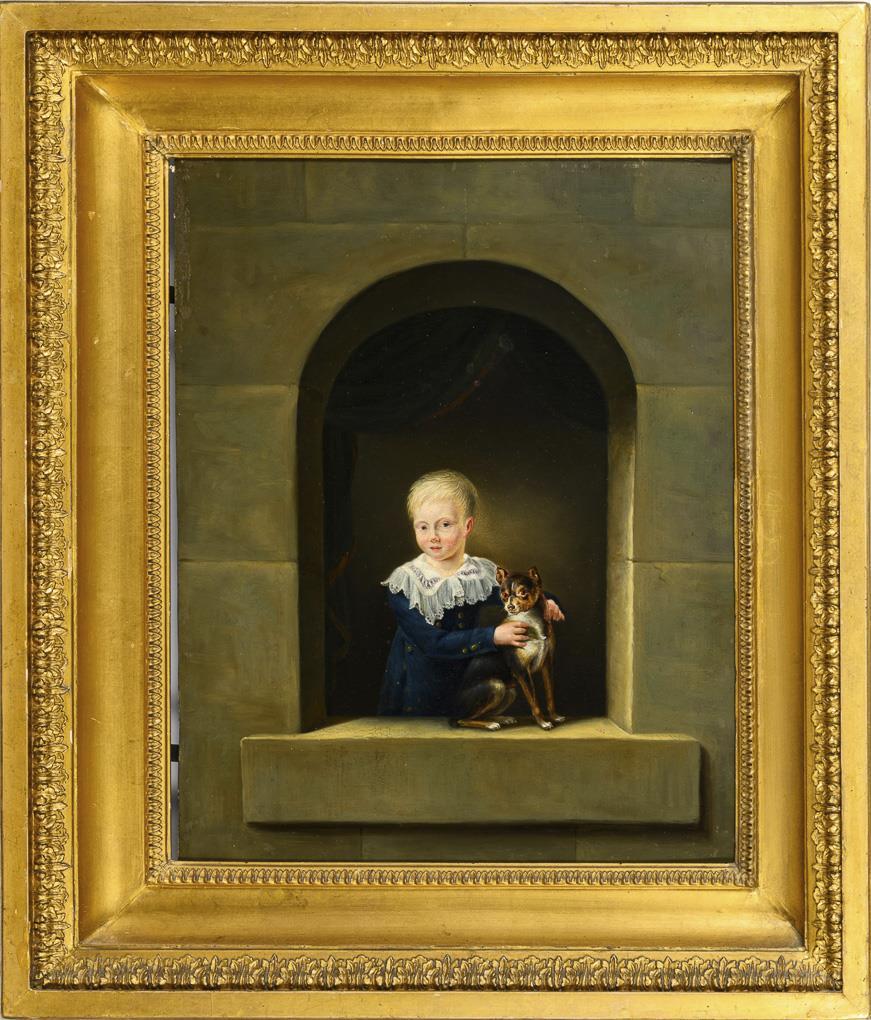 Portrait of Anton Günther (* 1805) after the model of the old masters in a window with a round arch and a small dog on the ledge. Traces of age.