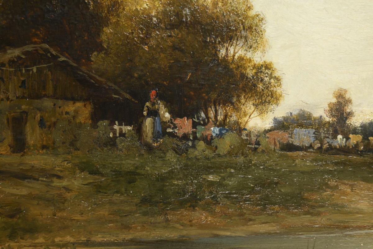 Small peasant hut by a shallow body of water with chickens and a peasant woman hanging up her washing. Small notches in the sky.
