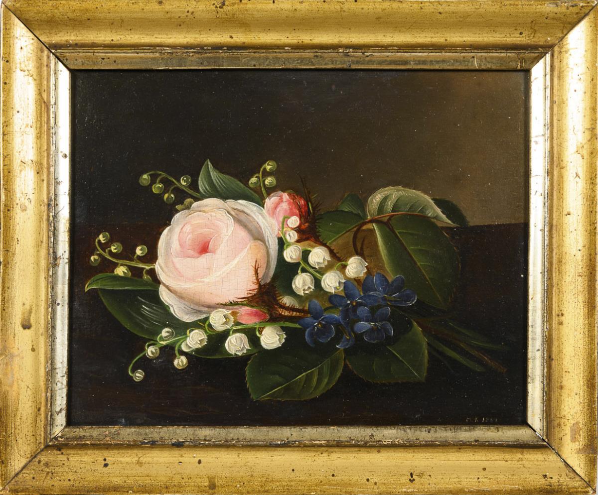 Bright red roses with violets and lily of the valley. Slight traces of age.