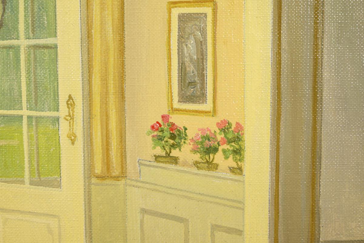 Warm sunshine falls through the open balcony door into the high rooms of the house. A small restored area.