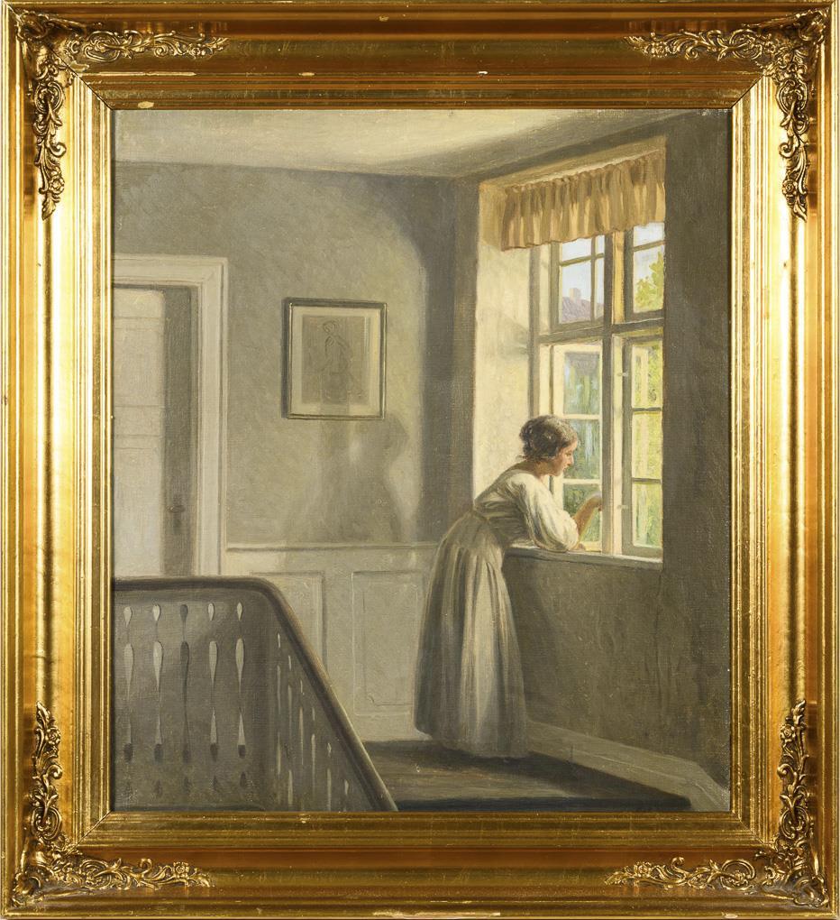 Young woman in a white dress at an open window in the stairwell. Two very small defects.
