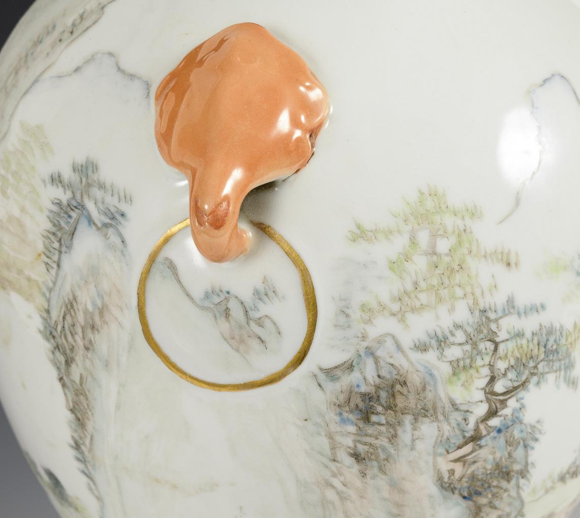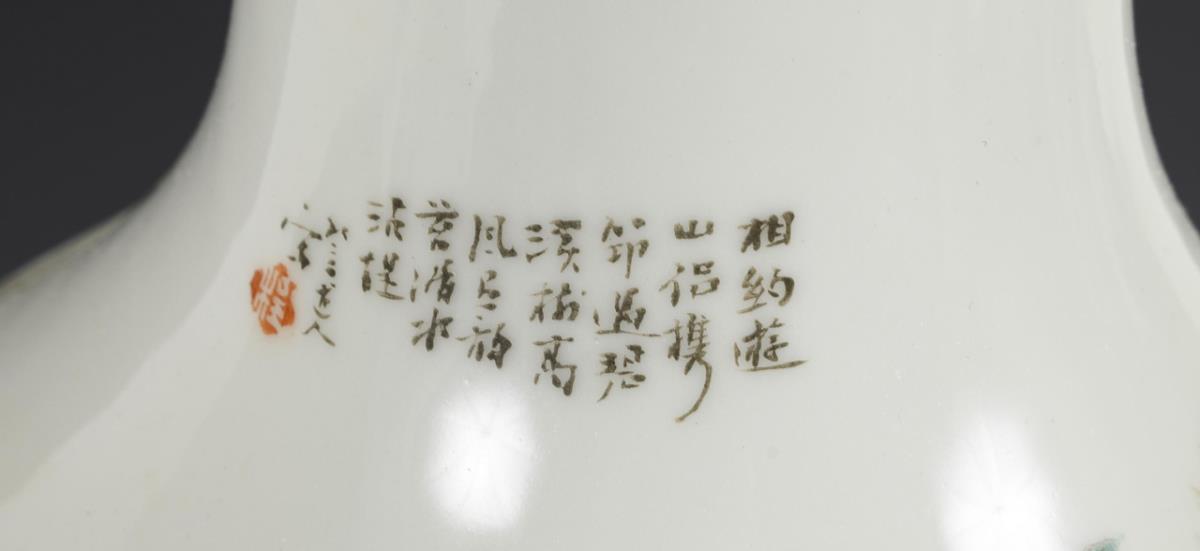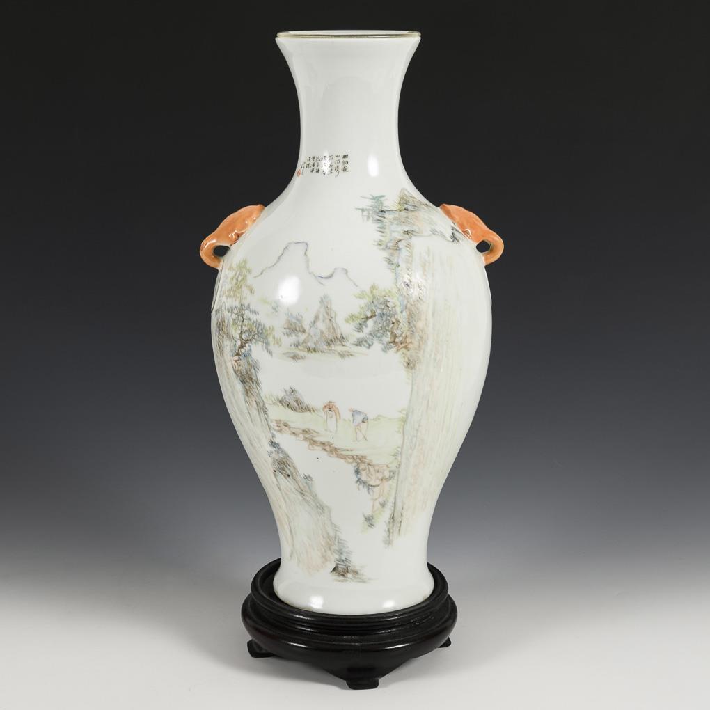 Mountain landscape with pagoda and peasants, in delicate pastel colors. Small inscription block on the neck. Thick, white glaze with tiny production flaws on the foot and in the wall. With wooden base.