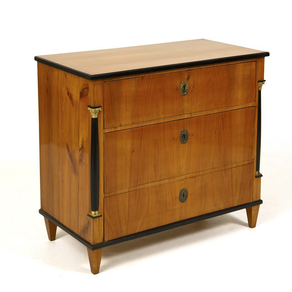 Simple, 3-tier chest of drawers on 4 tapering feet; decorated with ebonized half-columns with gilded capitals and bases. Restored, veneer with small additions.
