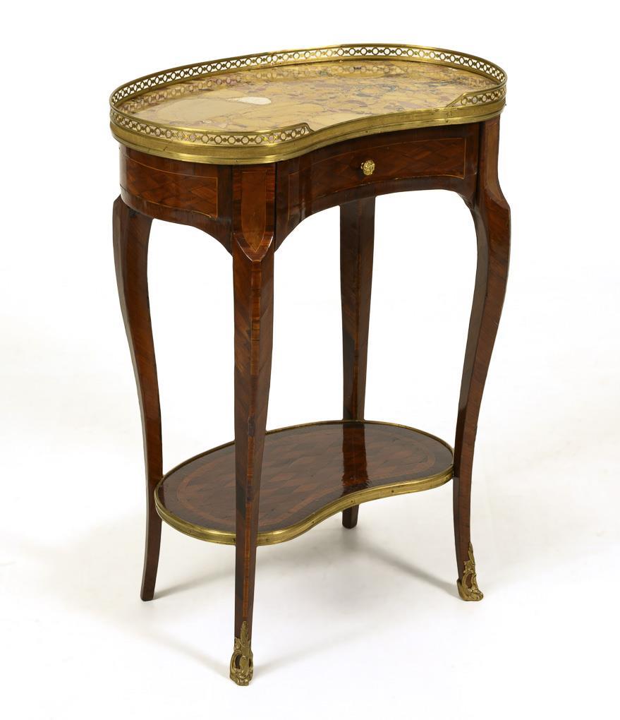 Kidney-shaped side table in transitional style on 4 slightly curved legs, with plinth shelf, frame drawer and yellow-red-blue marble top (Brèche Jaune); decorated with diamond marquetry, brass gallery and applications. Signs of age/use, veneer partly glued, veneer with small defects.