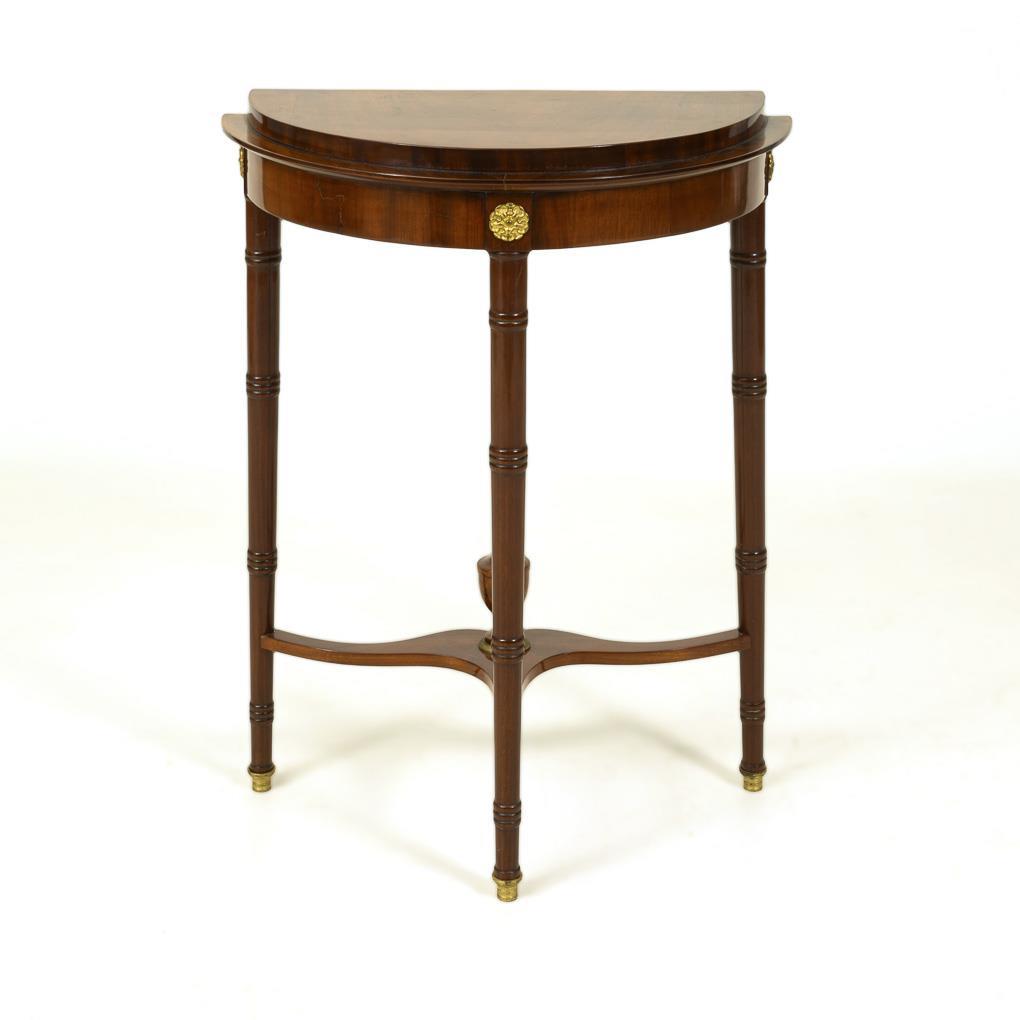 Delicate console table on 3 conical legs with curved foot struts and urn finial; accentuated with brass applications. Fully restored.