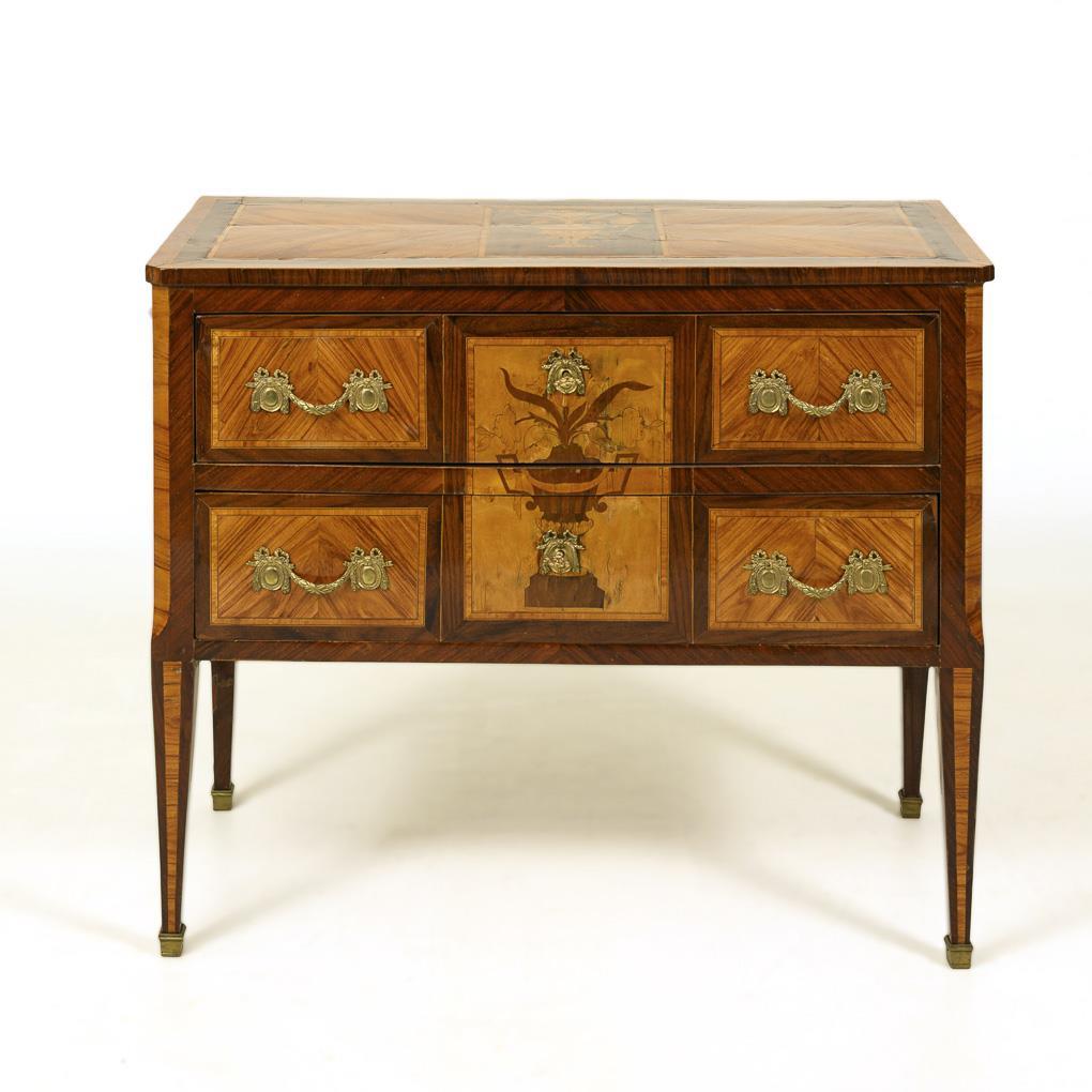 2-tier chest of drawers on 4 tapering pillar legs, decorated with mirrored rosewood veneer, floral marquetry and bronze applications. Signs of age/wear, dry cracks, top panel warped, 1 lock replaced.