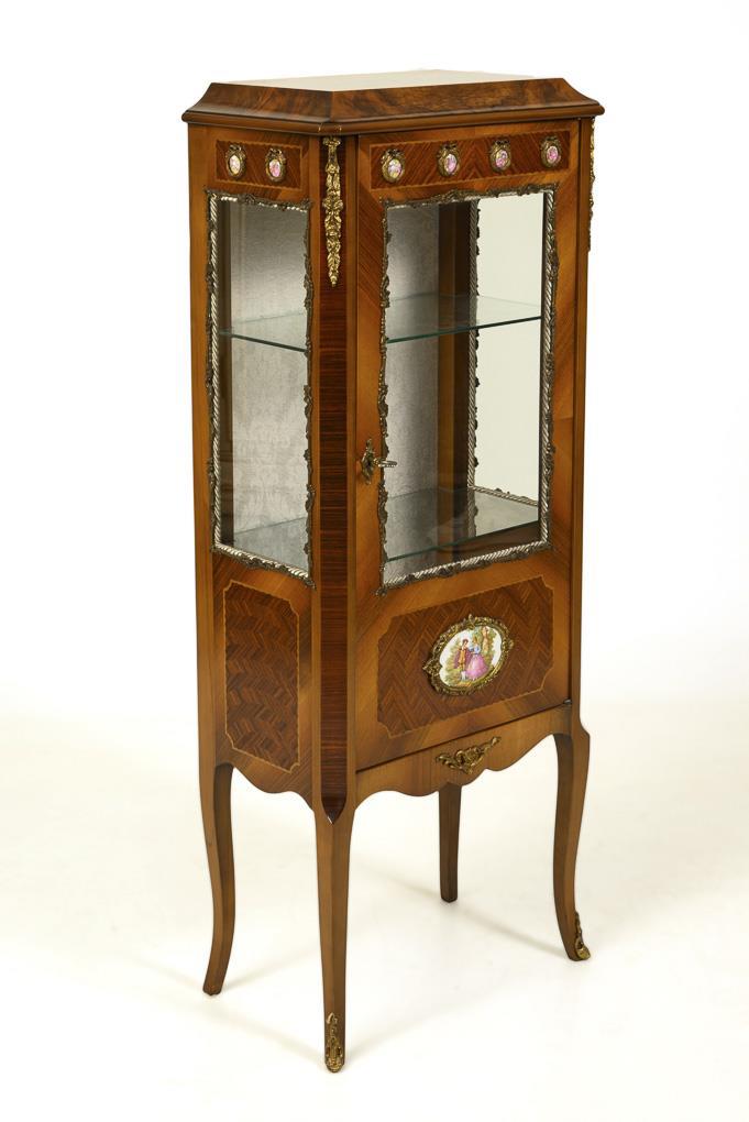 Elegant 3-sided glazed pillar display cabinet on 4 slightly flared legs, lavishly decorated with rocaille brass bands, 8 porcelain plaques with printed scenes from the "Fêtes Galantes" and herringbone marquetry; back wall lined with light-colored fabric on the inside, 2 glass shelves. Door does not close, minimal signs of age/use.