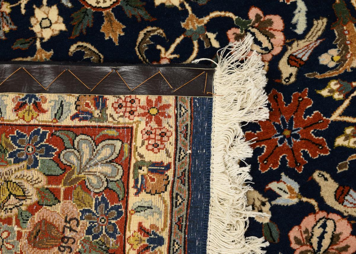 Central field with a midnight blue ground and colorful floral scroll decoration with birds. Three-row border with a red ground and palmette decoration. Knotted fringes, leather-reinforced long sides on the verso. Slight signs of wear.