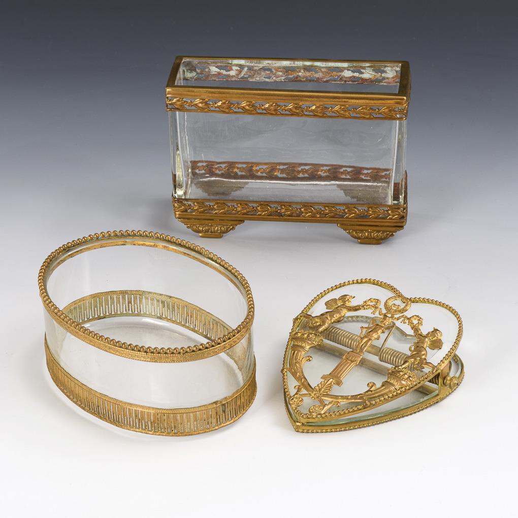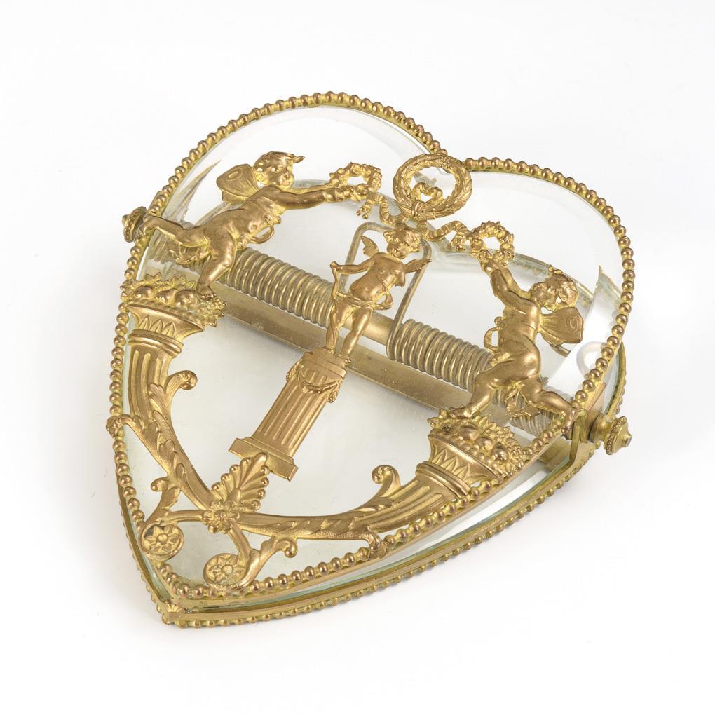 Square jardiniere with surrounding brass laurel friezes on the glass insert / Oval glass bowl with surrounding fine brass mountings. / Heart-shaped glass clamp with surrounding pearl bands; fine brass appliqué on the faceted upper glass: Putti standing above cornucopias crown the Cupid boy standing on a pedestal. Small chips to the glass of the clamp, 1x of which has been repaired.