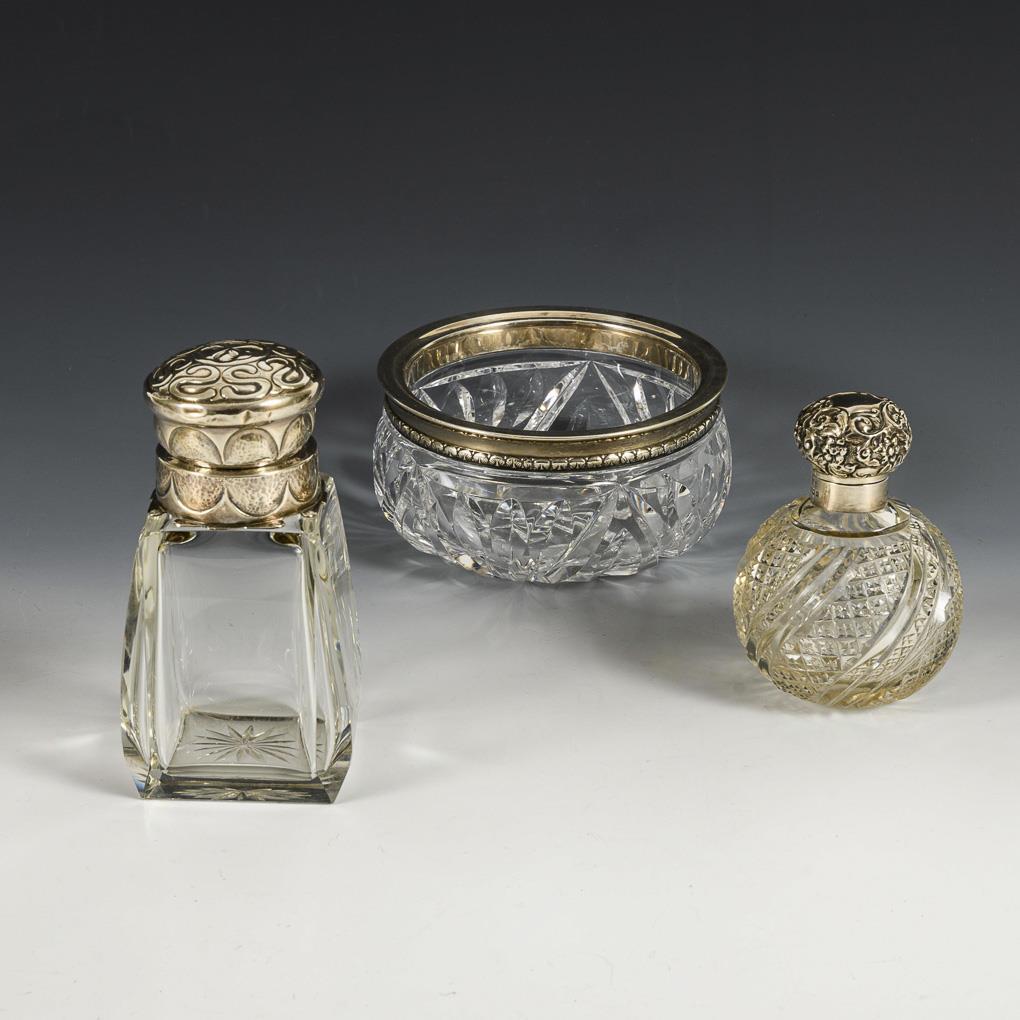 Art Nouveau glass jar with silver lid in relief (H 16.5 cm), richly cut bowl with silver rim (H 7.5 cm, Ø 15 cm), flacon with hinged lid in relief (H 12 cm). Few, small chips.