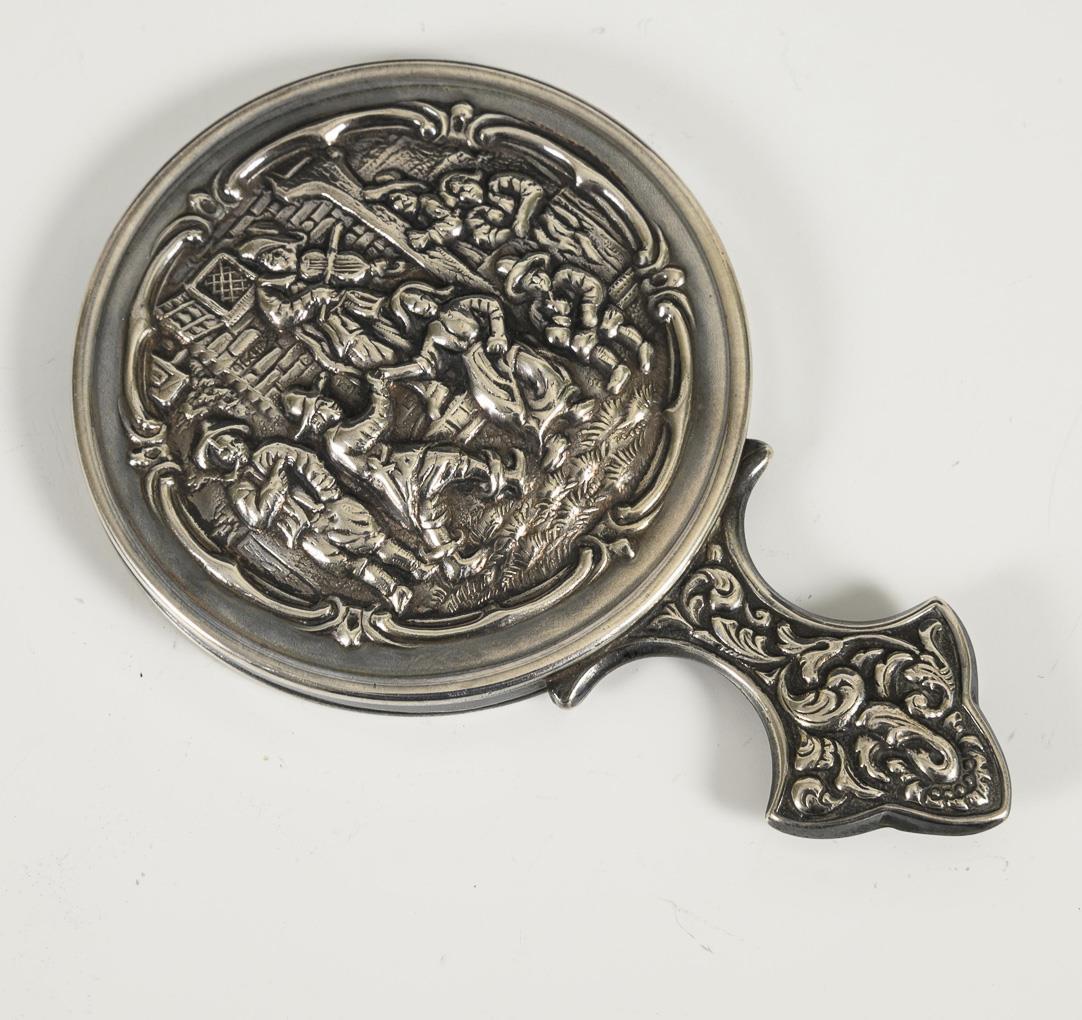 Glass flacon, oval silver bowl with putti, silver box, comb of the "Holland-America-Line" and matching small mirror.