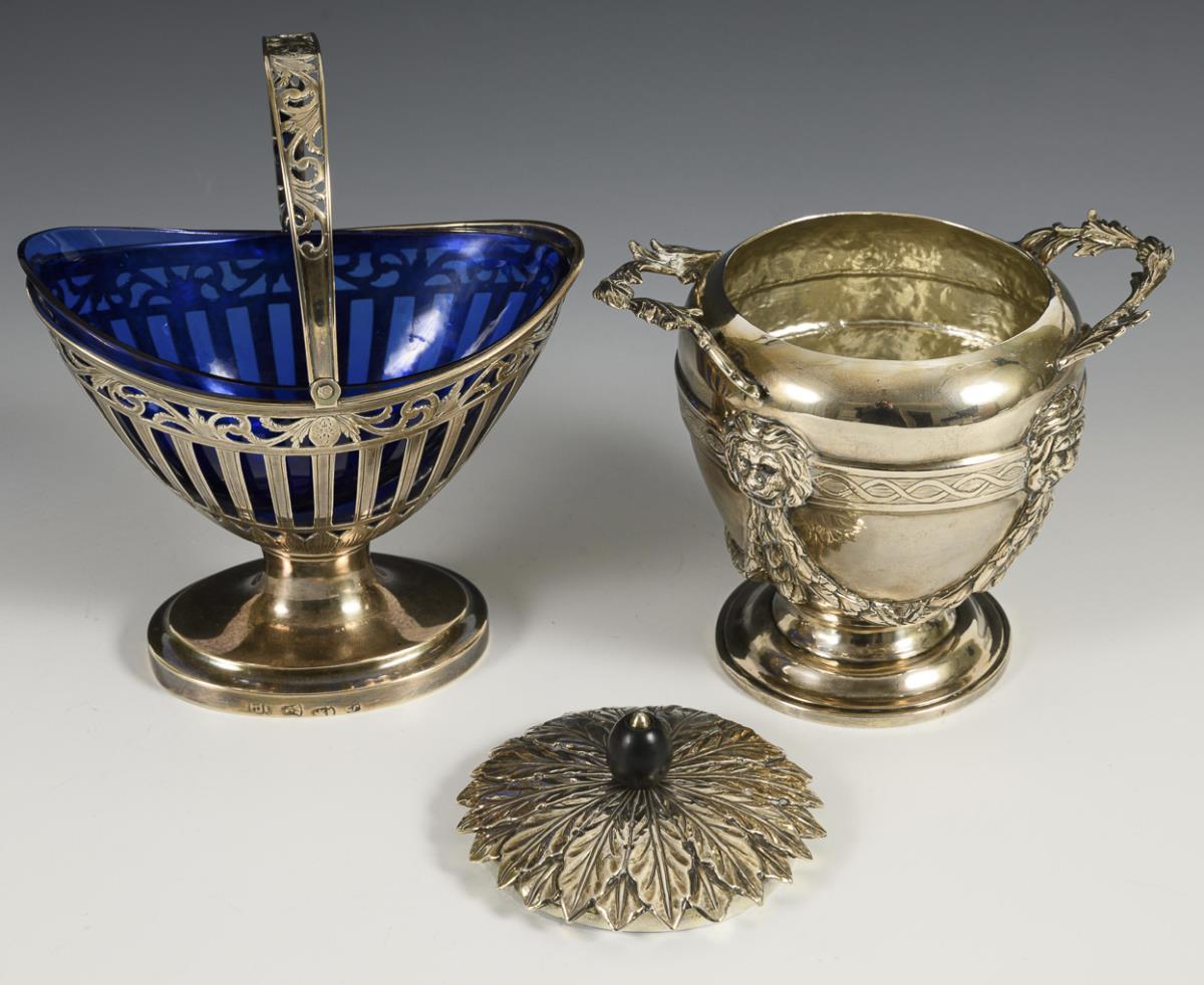 Sugar bowl with lion heads in relief, garlands and leaf lid with ebonized knob. H 13 cm. / Openwork silver basket with cobalt blue plastic insert. 11 x 13.5 x 9 cm.