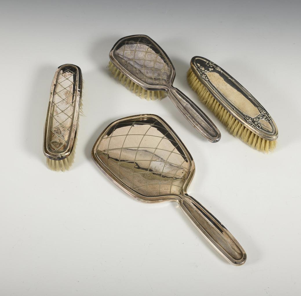 2 brushes and mirror with diamond pattern. 1 English brush with vine leaf decoration in relief. Silver fittings partly dented, signs of age.