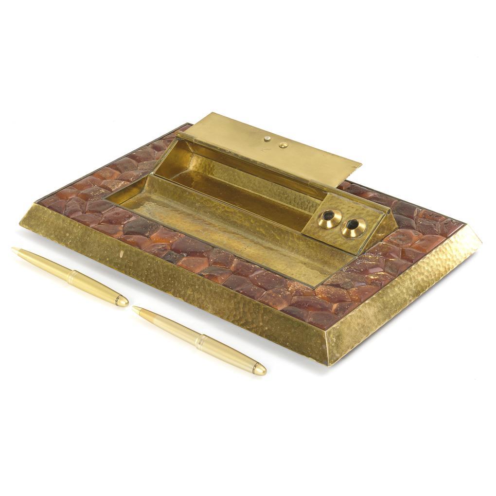 Weighted plate with beveled brass edges, incrusted with amber on top. Pen tray in the center and compartment under the hinged lid as well as 2 sockets as pen holders.