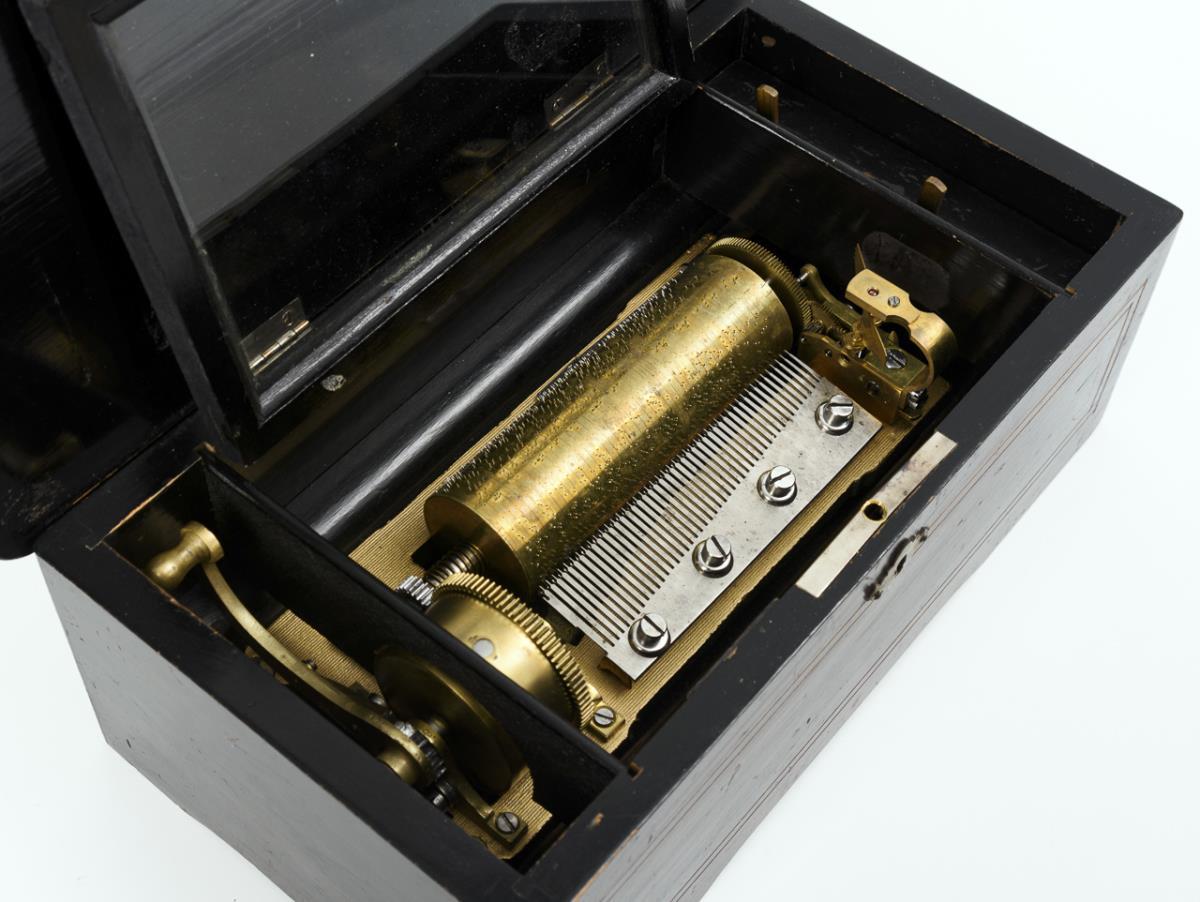 Case of the music box in the front and on the hinged lid mock cassettes with thread inlays, marquetry on the lid: shawm with notes on a branch. Inside, under a glazed inner lid, barrel movement with reed comb and stone-mounted wind wheel (4 songs). Next to the movement, ratchet winding mechanism and 2 adjusting levers. Plays with little background noise.