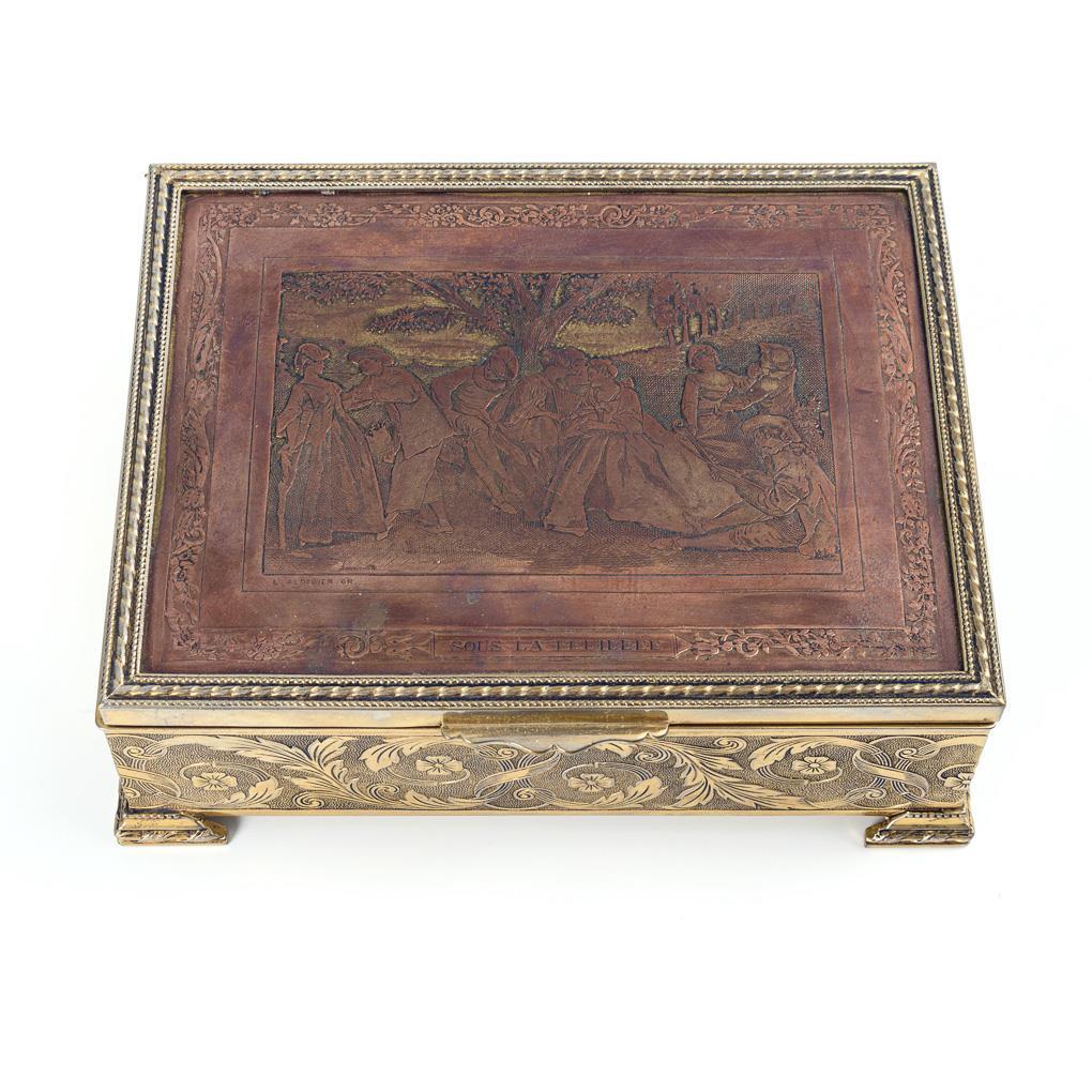 Casket with surrounding acanthus tendril, copper plate inset on the hinged lid with courtly society ("Sous La Feuillée" titled, "L. Aldigier GR" inscribed). When opened, the music box. plays.
