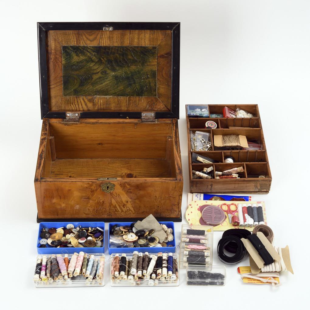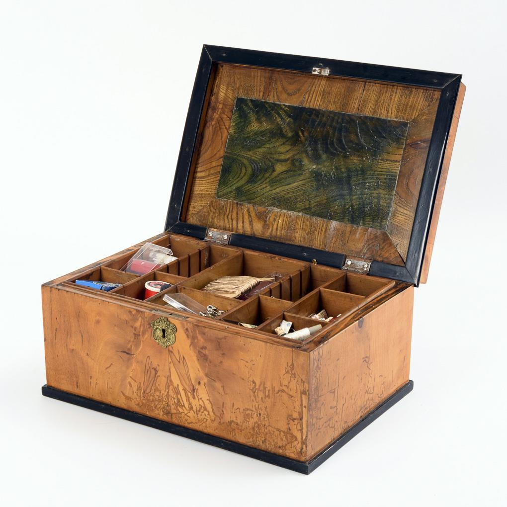 Plain casket, the lid ash veneer with green-painted sham box. Removable drawer with numerous sewing utensils in the many compartments. Restored with minimal additions, lid somewhat warped, filled anobia marks, few signs of age/use.