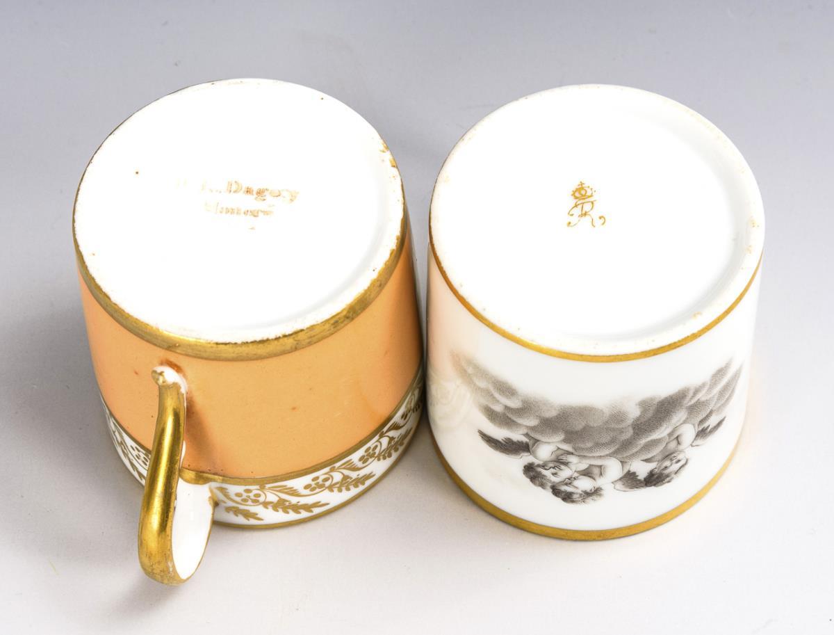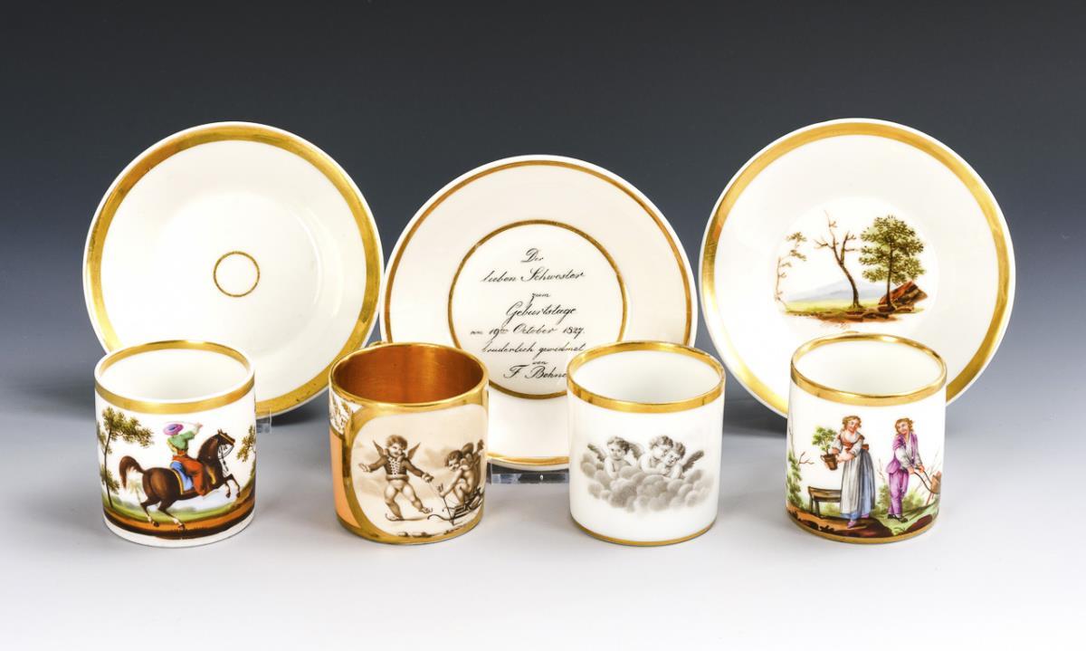 Cylindrical cups with ear handles. With various depictions (putti on clouds, Turkish horseman, pair of gardeners, skating putti).