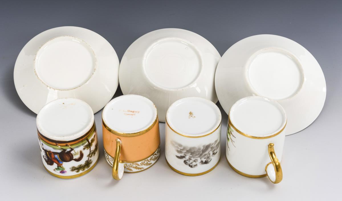 Polychrome painted, decorated in gold. 4 cups (h 6.5 cm), 3 saucers (Ø 13 cm).