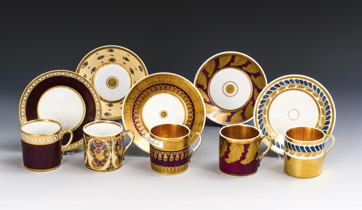 3 different cups with purple ground and gold painting, 1 cup with polychrome ornamental painting, 1 cup with gold ground and blue band. 1 saucer with hairline spider, partial gold abrasion, 1 cup with glued handle.
