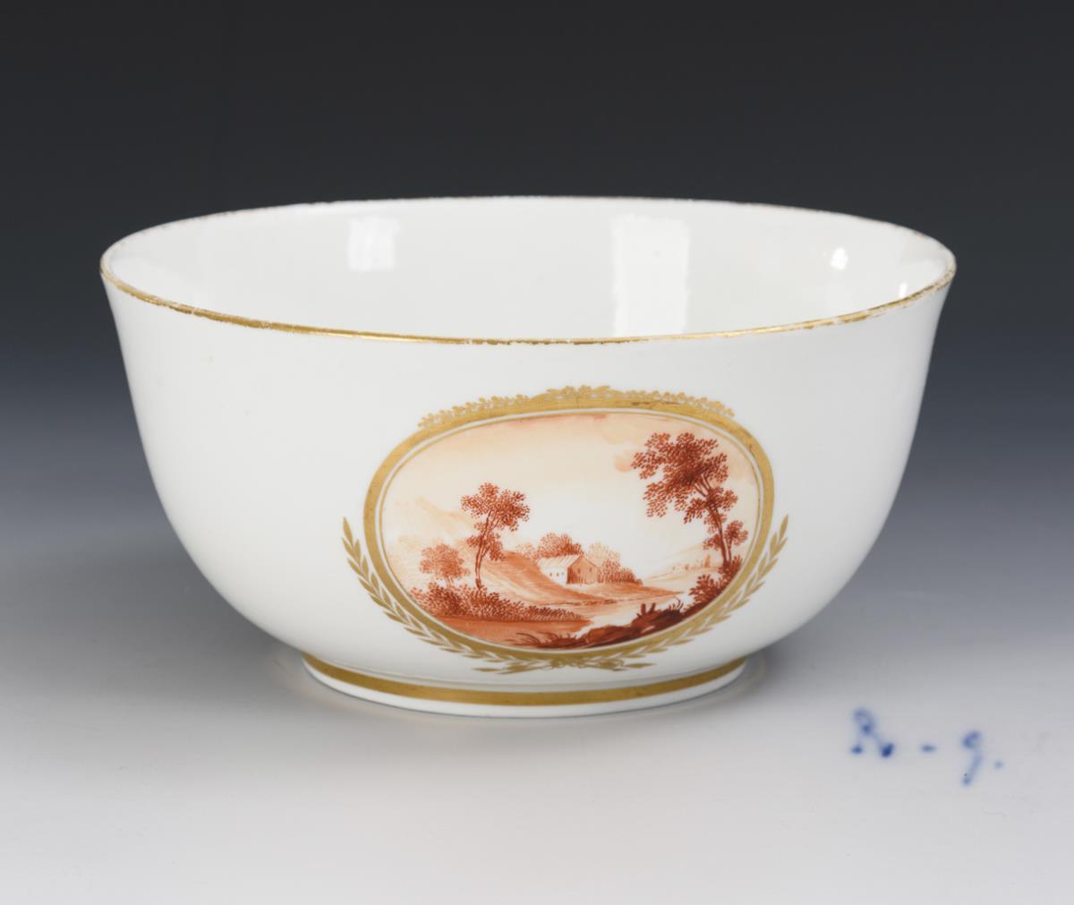 On both sides a medallion with the depiction of a river landscape painted in coral red. Gold rubbed.
