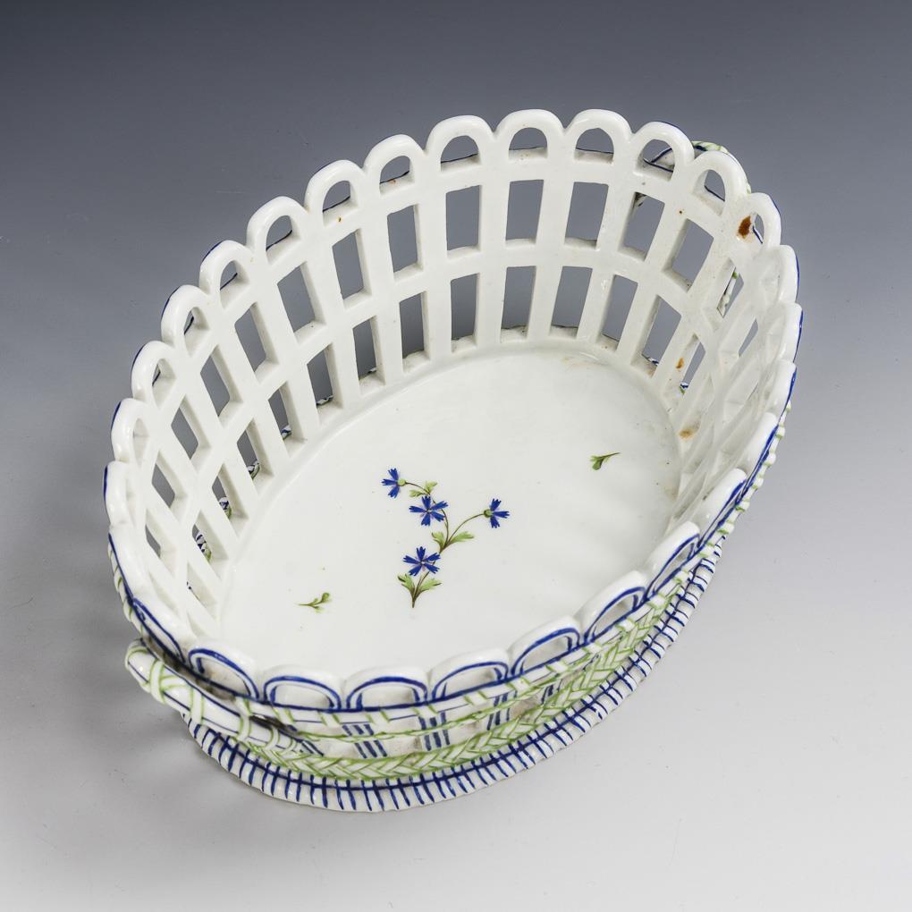 1x Fürstenberg: dessert plate with circular openwork on the rim and underglaze blue flower painting (Ø 24 cm). / 1x Niderviller: blue-green painted basket with a carnation stem in the mirror (L 25 cm). Basket restored.