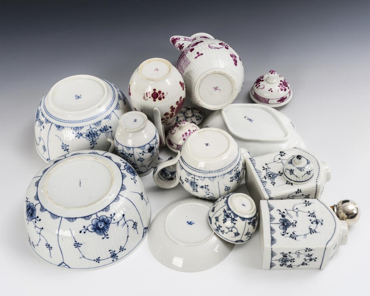 9x with underglaze blue, inlaid strawflower painting: 2 chums (Ø 16 and 16.5 cm), 1 Koppchen (H 5 cm), 1 saucer (Ø 11.5 cm), 1 quatrefoil bowl (L 17 cm), 2 tea caddies (of which 1x with added stopper; H 12.5 and 14 cm), 1 small pear jug (H 12 cm) and 1 small teapot (H 9.5 cm). / 2x with purple painting: 2 pear jugs with broken ribbed walls (H 15.5 and 21 cm). 1x hairline crack in the jug handle, 2x snipe bumped.