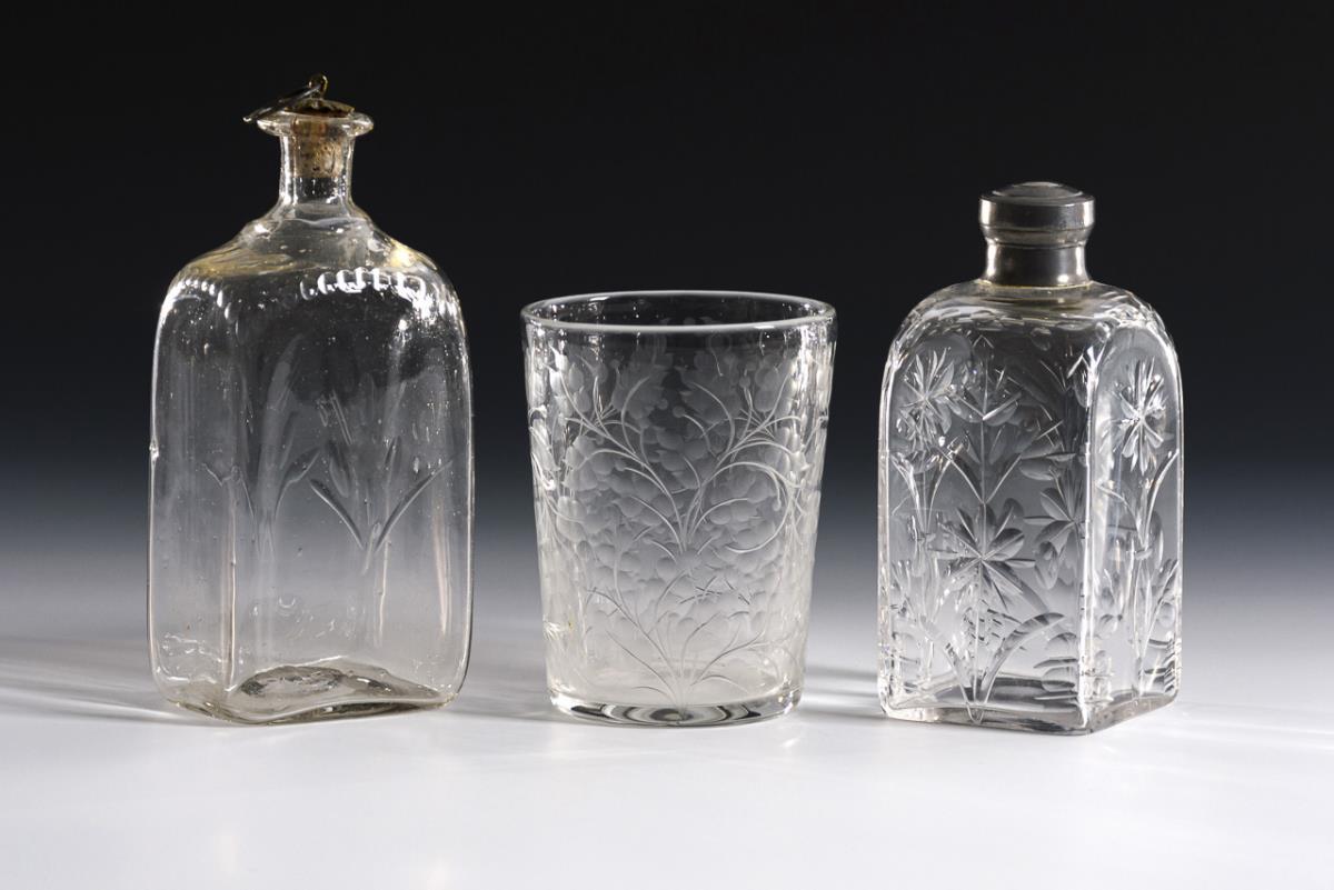 Square bottles with notch, lentil and olive cut, 1x with stopper and 1x with later mounted pewter screw cap (h 15 cm). / 1 conical beaker with finely engraved tendrils (h 11.5 cm). 1x stress crack to the neck, 1x knock to 1 cut edge.