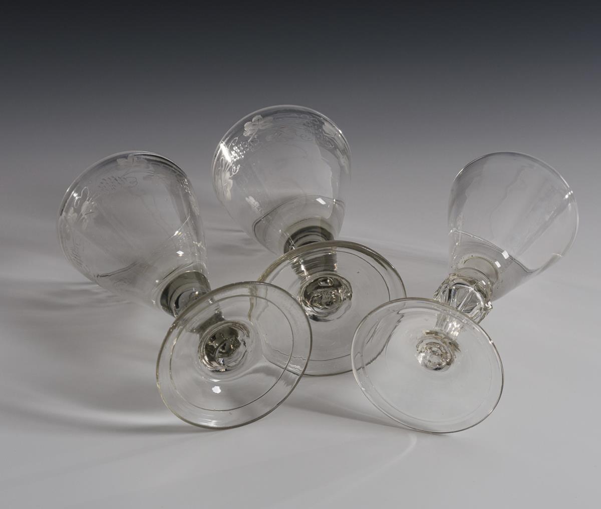 2x with conical dome merging into the solid shaft with engraved vine tendril, round base; demolition (h 18 cm). / 1x with conical bowl, ball finial, pseudo-faceted hollow stem, round foot with folded rim; demolition (h 18.5 cm).