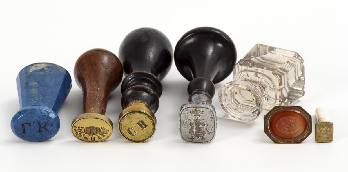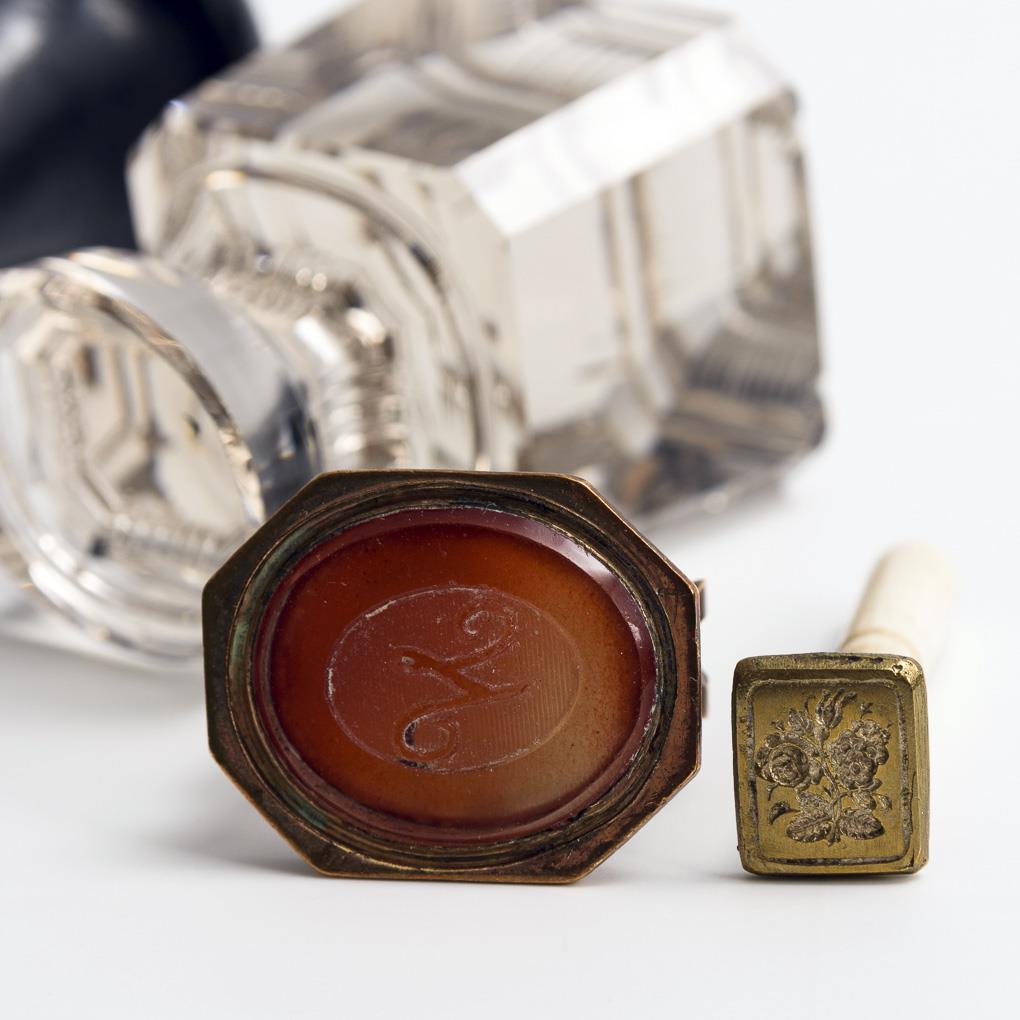 Rock crystal petshaft without engraving. Berlocke with engraved "N" in carnelian. Pet shafts with wooden handles: "H.G.", engraved maltster's coat of arms or guild mark. Bone typar with floral engraving. Gilt box marked "E. Vagnozzi Roma", with the alliance coat of arms on the lid. Leather case with pearl embroidery and gold embossing on one side. Hardly any signs of age/use.