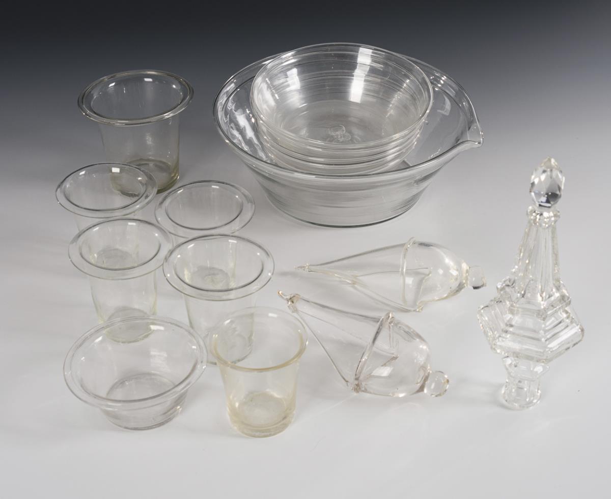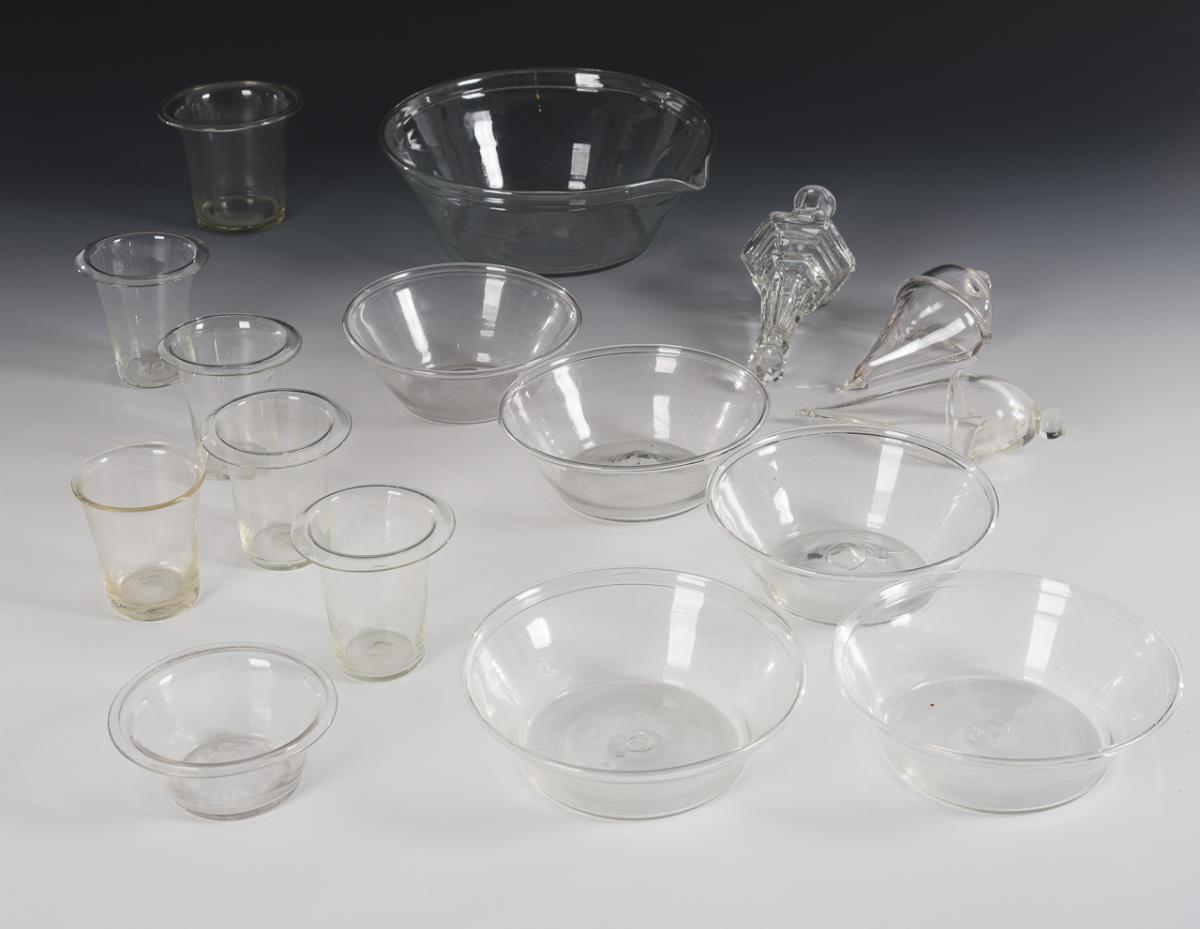 1 bowl (Ø 24 cm), 5 bowls (Ø 14.5-16 cm), 1 small bowl (Ø 10 cm), 3 + 1 + 1 beaker with crater rim (h approx. 7.5 cm and 1x H 9 cm), 2 barometers (L 16 and 17 cm) and 1 pseudo-facetted glass tip (L 20.5 cm).