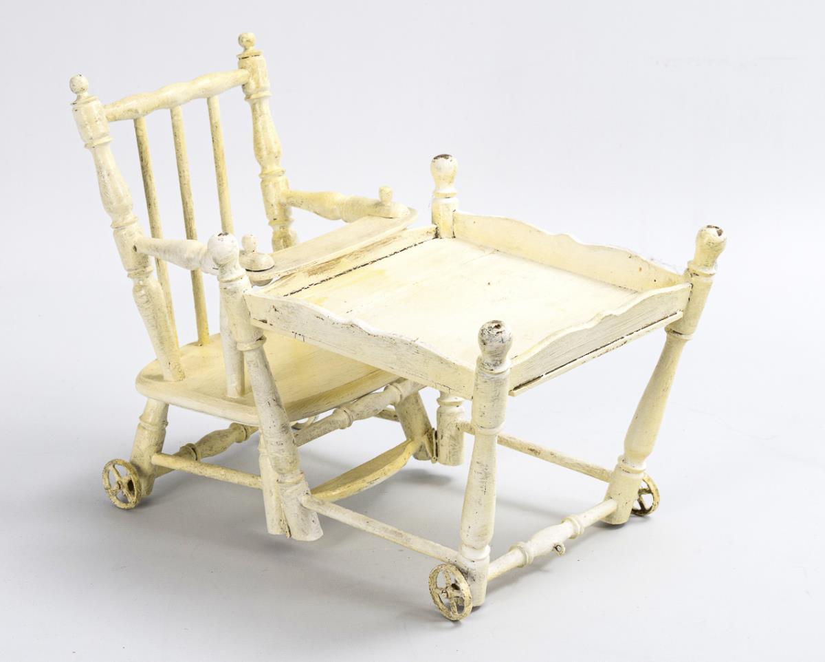 Doll with crank head, blue sleeping eyes, eyelashes, brown real hair wig, 15-part jointed body and pale pink dress, l 48 cm. Head x-rayed: without defects, body with small color defects, hands painted over (left with repaired fingers). White painted, foldable high chair with turned sticks. H 30-50 cm.