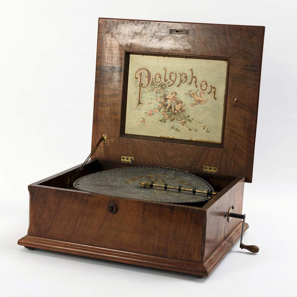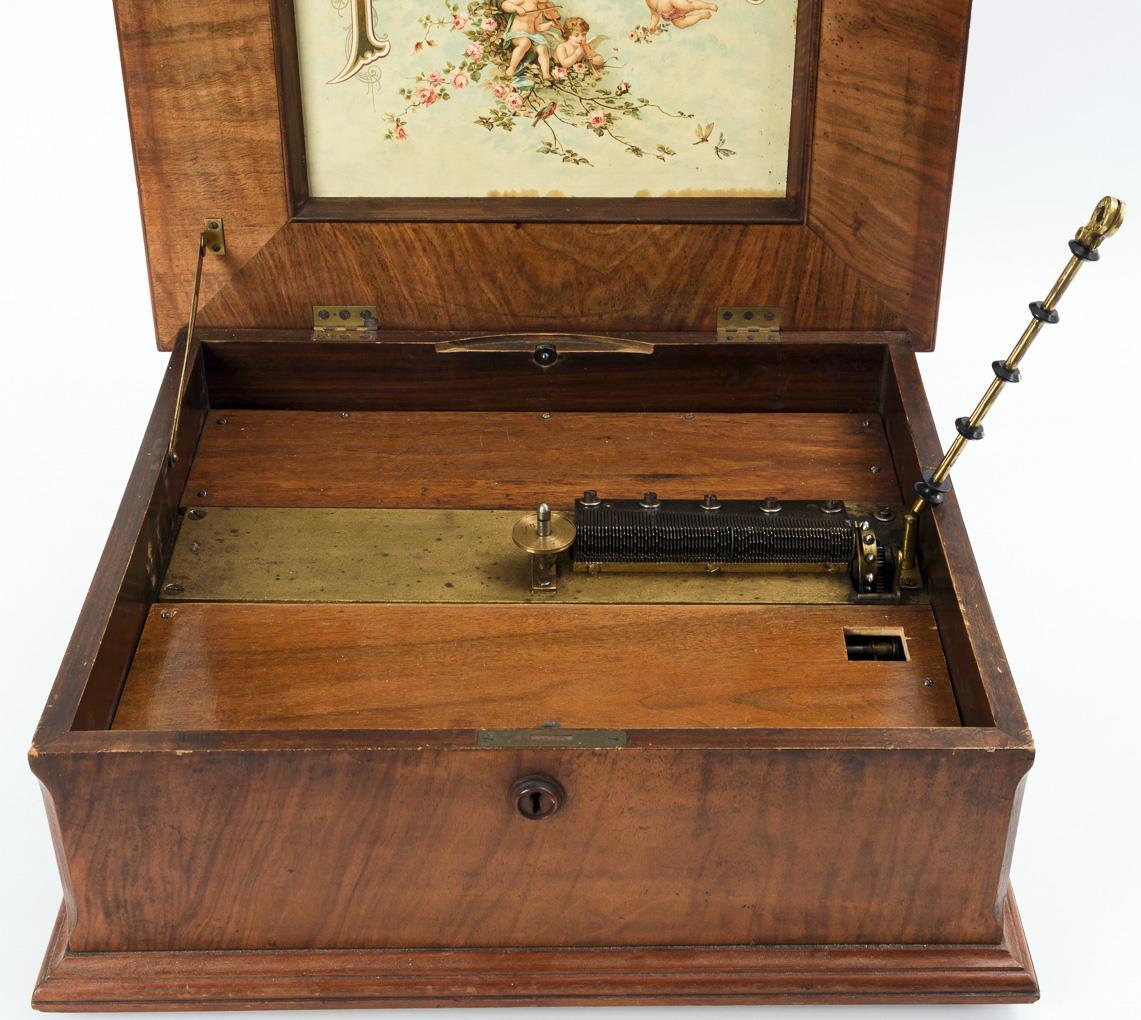 Large "music box" with moldings. "Engraving" with lyre on the hinged lid in the false cassette; color lithograph with company name and putti playing music on the lid. Tongue comb mounted on the star wheel on a gold-bronzed base plate and rim drive for plates with rim perforations. Polyphonically marked perforated plates, e.g. Ein Walzertraum, Loreley, Dolores, Auf den Wellen, Elfengrab, Bohemian etc. Some signs of age/use on the case and plates, 2 reeds restored. Movement plays with slight clanking noises, start function in need of overhaul, saw hole above the wind wheel. 1 plate with small chipping at the edge, 2 plates with edge crack, 2 plates with cracked edge.