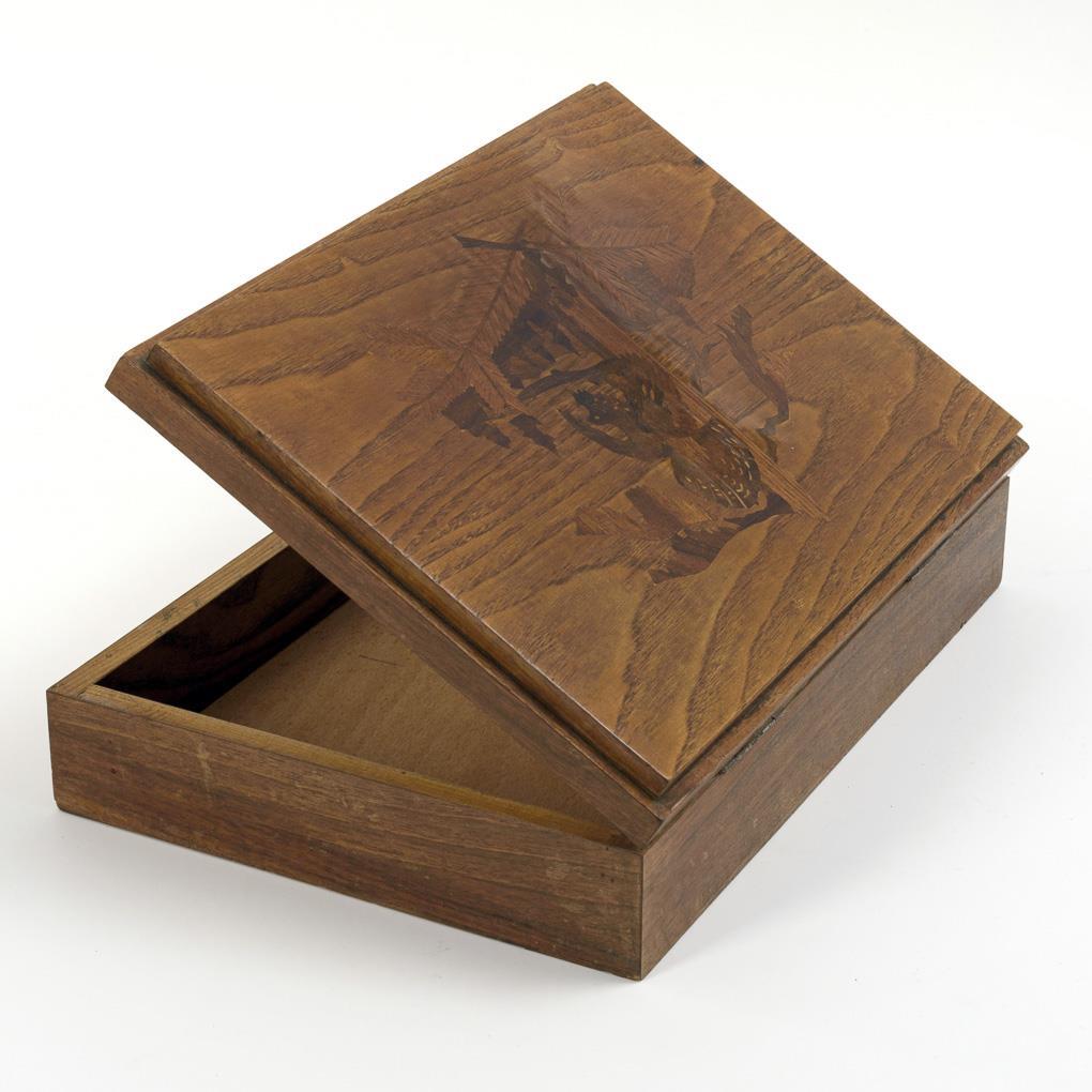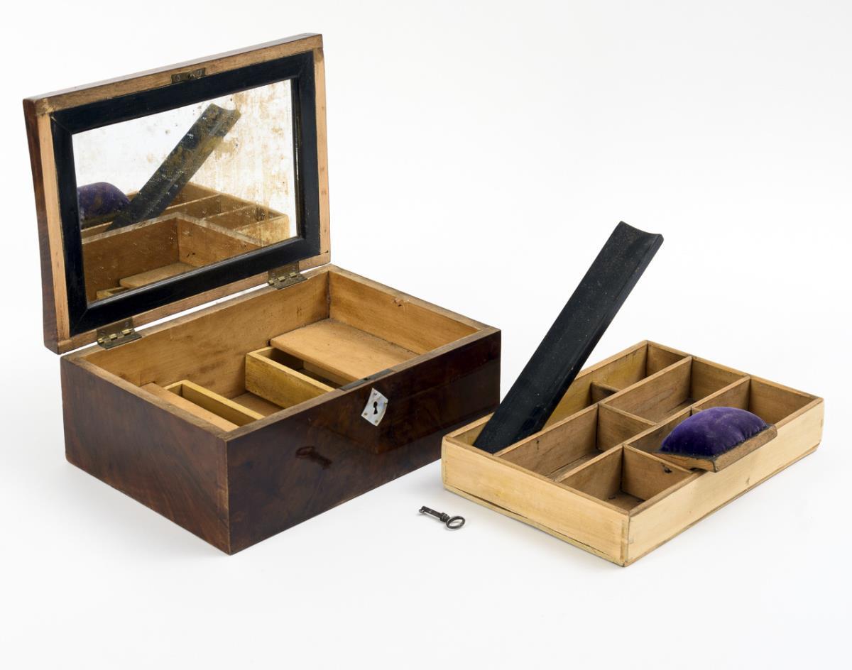 Ashlar caskets, 1x with profiled walls. On the hinged lids a mock casket, star rocaille ornament, a capercaillie and stars on all sides. Dark casket inside worked as a sewing casket with compartments and mirror in the lid. 1x warped lid restored, minimal repairs, mirror glass partly blind, otherwise hardly any signs of age/use.