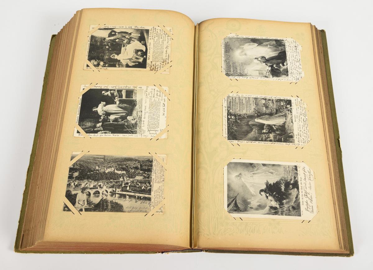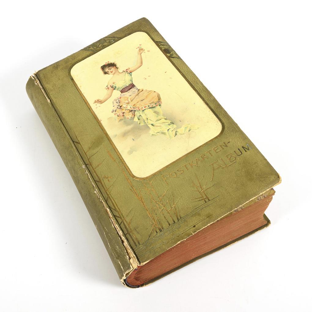 Approx. 480 cards, all mailed to an address in Magdeburg. Partly chromolithographs, partly embossed. Mostly genre pictures (often after paintings), depictions of animals and children, idyllic landscapes, flowers, some city views, a few portraits of actors and poets. Lime green leather binding on the cover with gold embossing and inset color lithograph. Album with signs of age/use.