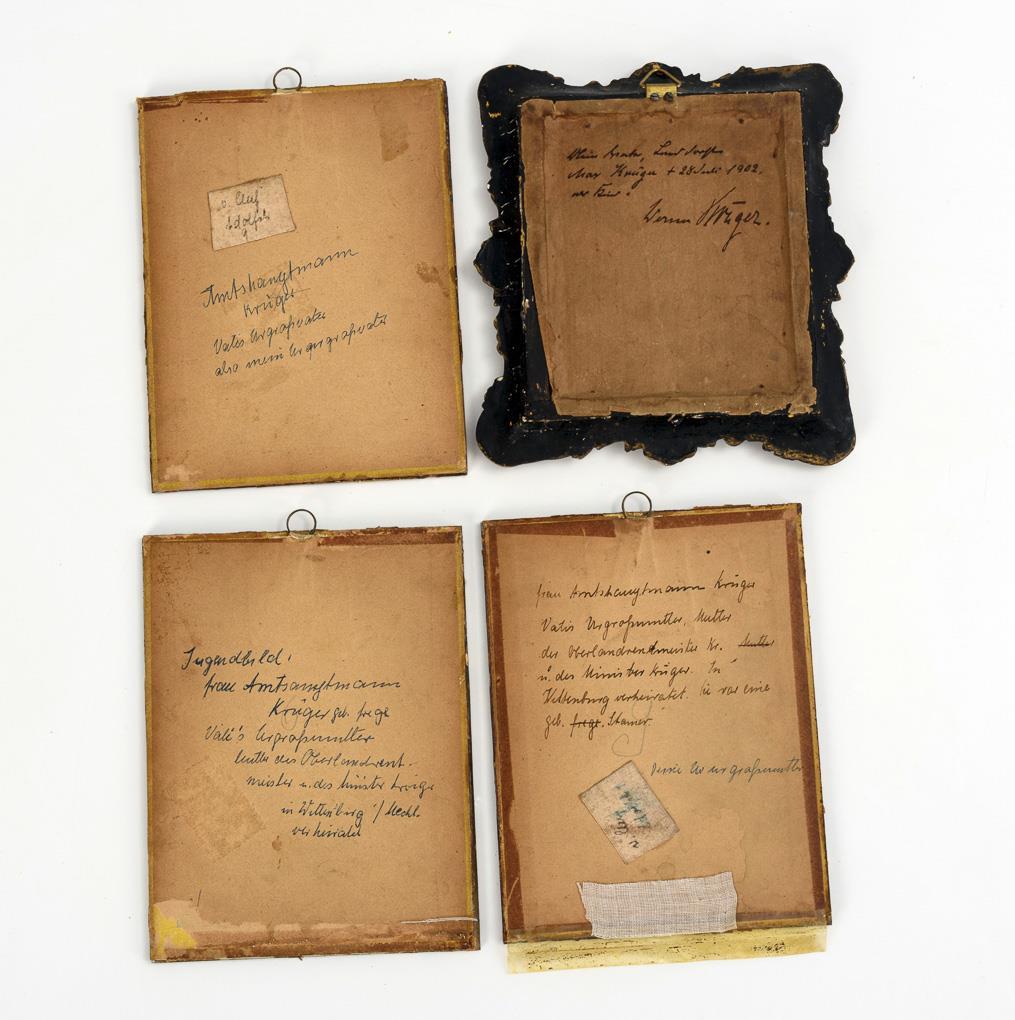 Behind glass with embossed gold paper as frame 3 silhouettes with pencil inner lines: Young couple and elderly lady; each inscribed on verso (Amtshauptmann Krüger and his wife). / In gilt stucco frame bust-shaped portrait of a boy; verso inscribed Max Krüger, died 1902. Parts slightly browned, framing partly defective, gilt stucco frame overbronzed.