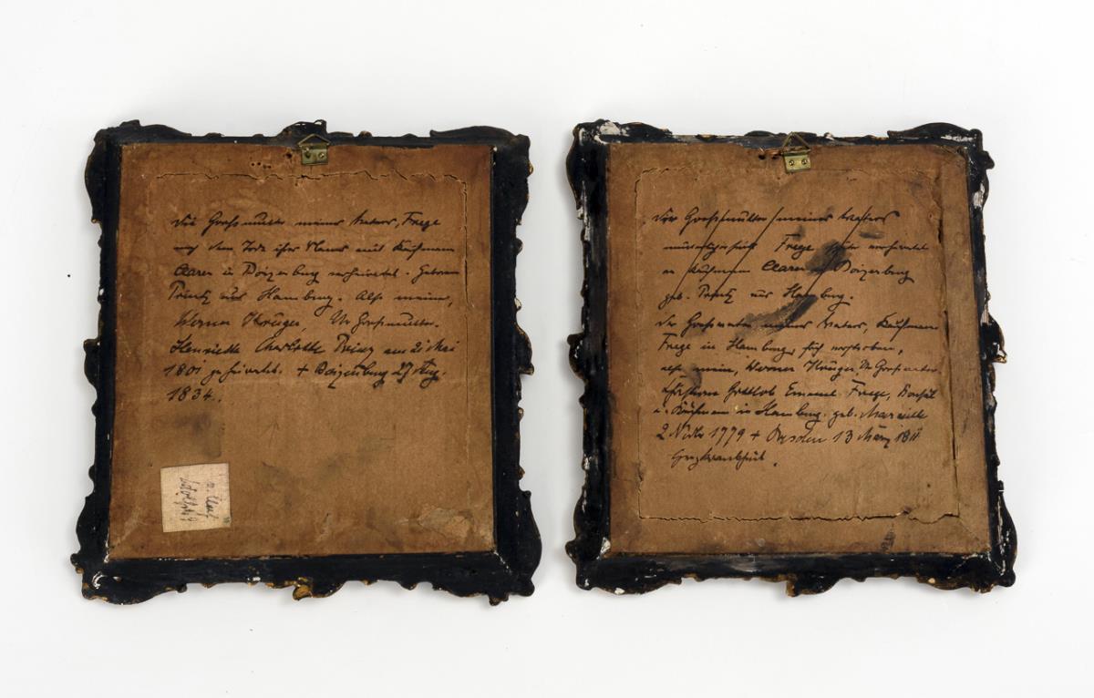 The merchant and Saxon consul in Hamburg Christian Gottlob Emanuel Frege (1779 Marseille - 1811 Dresden) married Henriette Charlotte Printz (1783 Hamburg - 1834 Boizenburg). Painting partly brownstained.